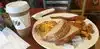Selected this place due to location and higher TA rating. Small line and almost full with additional seating upstairs. Good service and average food. Bill came to $38 for two people, and a pair of coffees for breakfast. Nothing bad to say, but the food was just average.