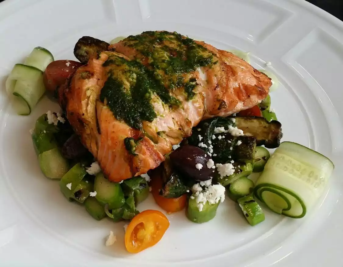I just love Café SFA. From the welcoming maître d' who always asks, “How are you?” to the beautiful view of Rockefeller Center rooftops and Fifth Avenue, to the unflagging excellence of Jaclyn, my favorite server, it’s the best for lunch in midtown. http://cafesfa.com/wp-content/uploads/2015/07/Cafe-sfa_Lunch.pdf The special includes a half sandwich (tuna or chicken salad) and a cup of their famous corn and crab chowder or the daily vegetarian offering ($21). The bread with raisins is a standout. Fava bean falafel is a carnival of color, crunchy and smooth, heavy dark lentil flavor lightened by lemon preserve and cucumber yogurt. With quinoa and marinated garbanzos, it’s so interesting you want to savor every morsel ($22). The lobster roll ($25) is generously sized and is accompanied by fries. A friend has it every time. Sirloin steak frites with choron (hollandaise and tomato puree) sauce on the side, fries with truffle oil and parmesan ($38) were a hit with a friend who was missing steak, and finally – the best salmon I’ve had all summer: Grilled salmon “Greek Salad” ($26) cooked well, with al dente veggies, and just a few crumbles of feta to sweeten the taste. Scrumptious. Can’t wait to go back (and wish I could eat here every day)!