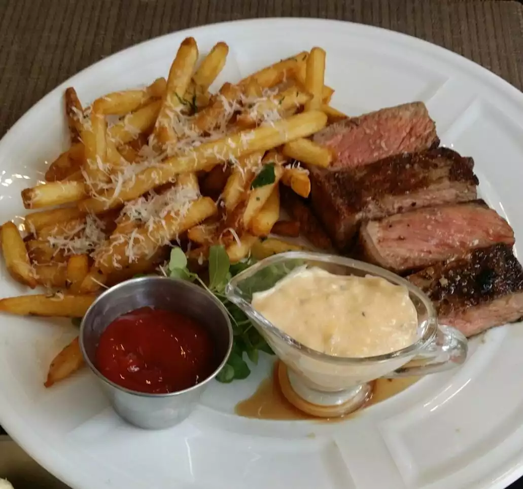 My girls and I stopped in for Shopping respite. We ordered a burger, fries, calamari and champagne. We shared the food and it was the perfect amount of food and rest that we needed to tackle the shoe sale rack. Wink!