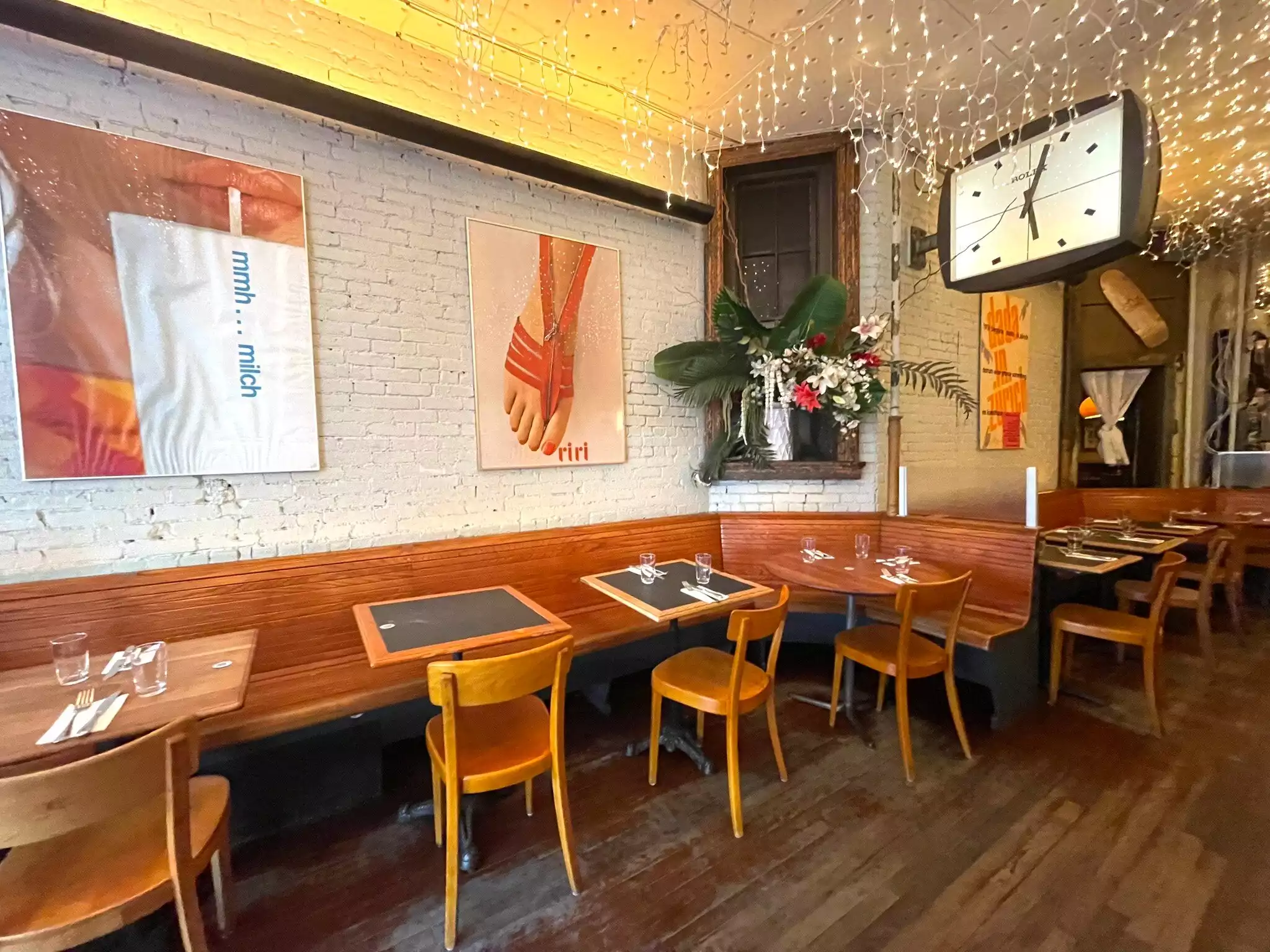We enjoyed a great dinner on Christmas Day. Great food, steak and fondue. Music was a mix of Brasil, Afro-Cuban and US 1950s. Set so you could chat but covered your neighbors. This spot is now our favorite in the neighborhood. Has a curtained nook if you wish to be descrete. Menu is wide ranging: fish, fondue, steak, schnitzel, salads. Try it.