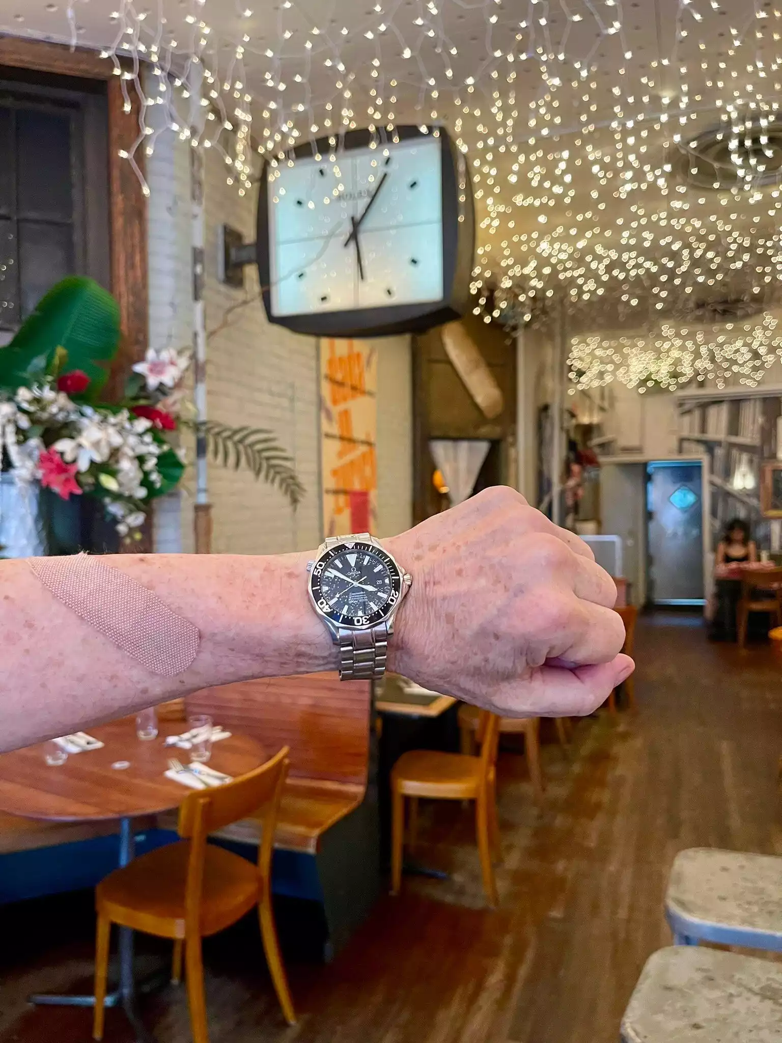 We merely stopped here for a refreshment on a very hot New York City day. Cafe Select had a nice menu but alas, we were still digesting our lunch. So a coke and a margarita were on the order. Sitting up at the bar, out of the heat, we caught up on our plans for the rest of the day. The decor is absolutely gorgeous, with eye catching posters and prints and bud lights sprinkled across the entire ceiling. Had to take a photo of the Rolex clock mounted from the roof with Jim’s Omega watch in the foreground. Rolex’s fame of keeping accurate time didn’t hold up well against the Omega. 😂😂😂 If you come to dine, there is seating outdoors on the pavement which is enticing. That along with the funky decor and great customer service, makes #cafeselect one to put on your list. #thewanderingreviewer#newyork2024 @cafeselectnyc #caféselect #cafeselectnyc #omegawatch