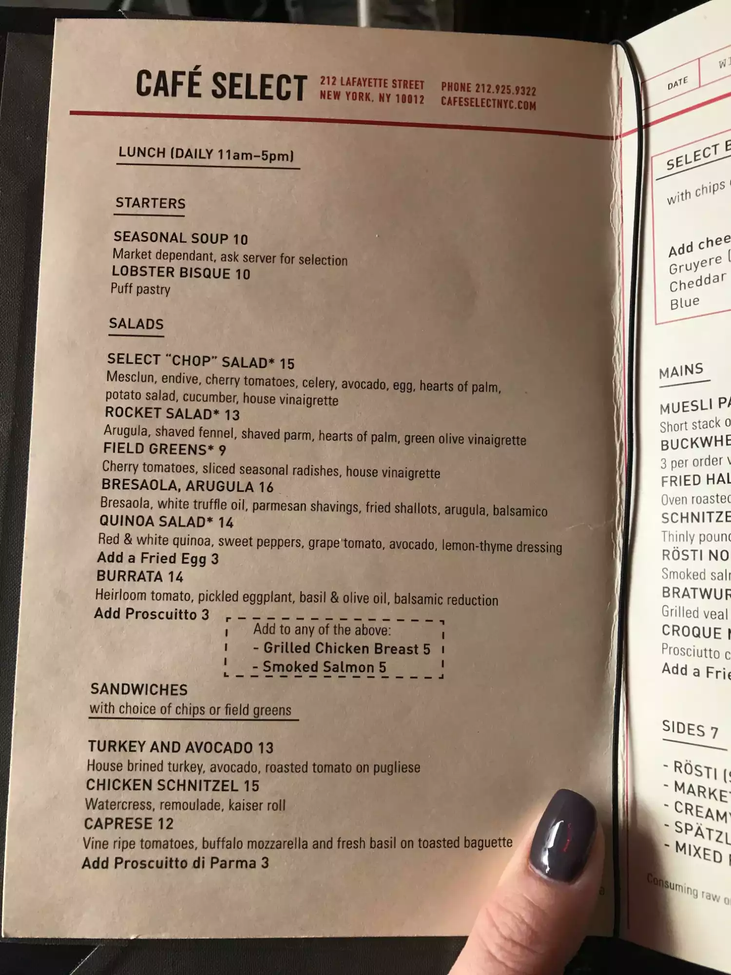 I popped into Cafe Select for a latte to go before a lunch meeting one day in NYC. Coffee was DELISH and the food menu looked terrific! I want to head back and stay for a meal next time. Highly recommend!