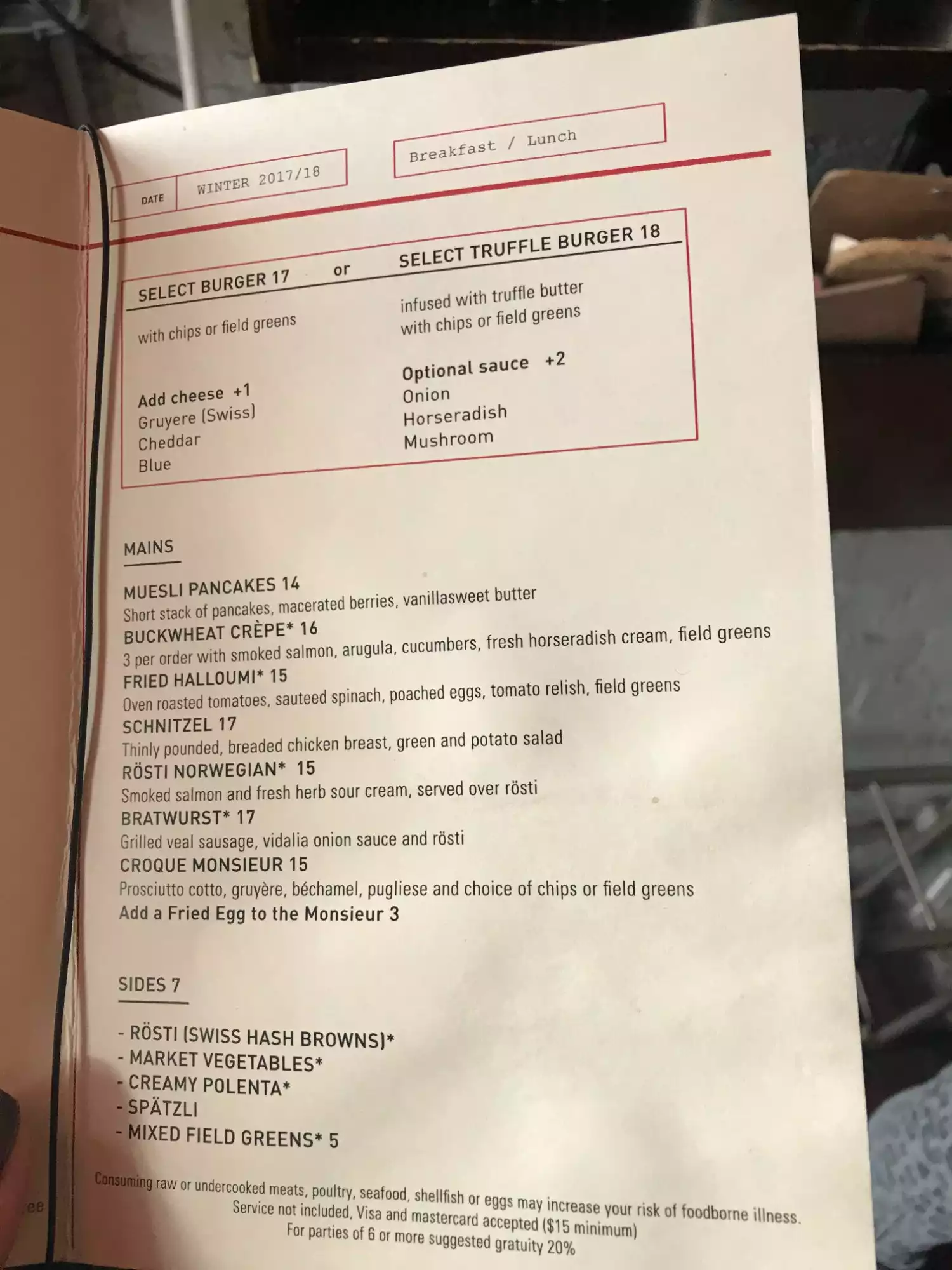 The restaurant is really nice, even if tables are a bit small. I would recommend to book as it's often crowded. I tried a rosti with a sausage but it was not so good because was burnt. Prices are consistent with NYC standard, but I found out they charged me a higher tip