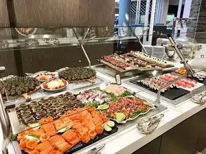 Universal City Hilton totally renovated the Cafe Sierra buffet area with open seating area and surrounding food stations. The breakfast buffet can either be continental breakfast or upgrade to full buffet. If you like the full buffet, it includes ; bacon, sausage, omelets, pancakes, potatoes, and chinese porridge. The continental includes; bagels, toast, pastries, fresh fruit, oatmeal, cold cuts, and smoked salmon. The dinner buffet has a complete selection of seafood. Crab, lobster tail, oysters, shrimp, cioppino, sushi, grilled salmon and more. The service was excellent.