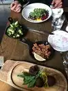 One in our party must eat gluten-free and I was afraid I wasn't going to find anything to eat (I do not eat gluten-free). The "Summer Platter" was very tasty! Rib-eye, chicken, roasted peppers, Yukon gold horseradish potatoes with an amazing watermelon, tomato, mint salad. I was least excited about the salad but finished my meal with it rather than dessert. The staff was friendly and knowledge about the food & drink. Casual environment; kind of rustic, dark wood tables.