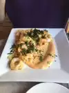 First time here and a great experience. We had calimari with a great sauce salmon rillette as appetizers. We all had great meals. Hamburger with carmalized onions and wonderful French fries, mobiere cheese and chicken sandwich, steak, and a croquet Monsieur with tomato and fried egg. Dessert was capoucino cheese cake with cream boule. Coffee was excellent. It was a great experience and food.