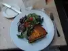 This was a big disappointment as I love French fare. Portion size for my salmon dinner entree was fine but the ratatouille seemed like leftovers that were reheated rather than something fresh. The salmon was slightly undercooked but edible. Service was adequate but it was left to the busboy to notice that I had not been offered any bread when I was served my entree. Perhaps they are looking to save more money. My bill indicated an extra fee for credit card payment, when I would have assumed it would already be built into the prices. Restroom was clean and there is a small outdoor dining section. Maybe they are just better for happy hour, when less is expected.