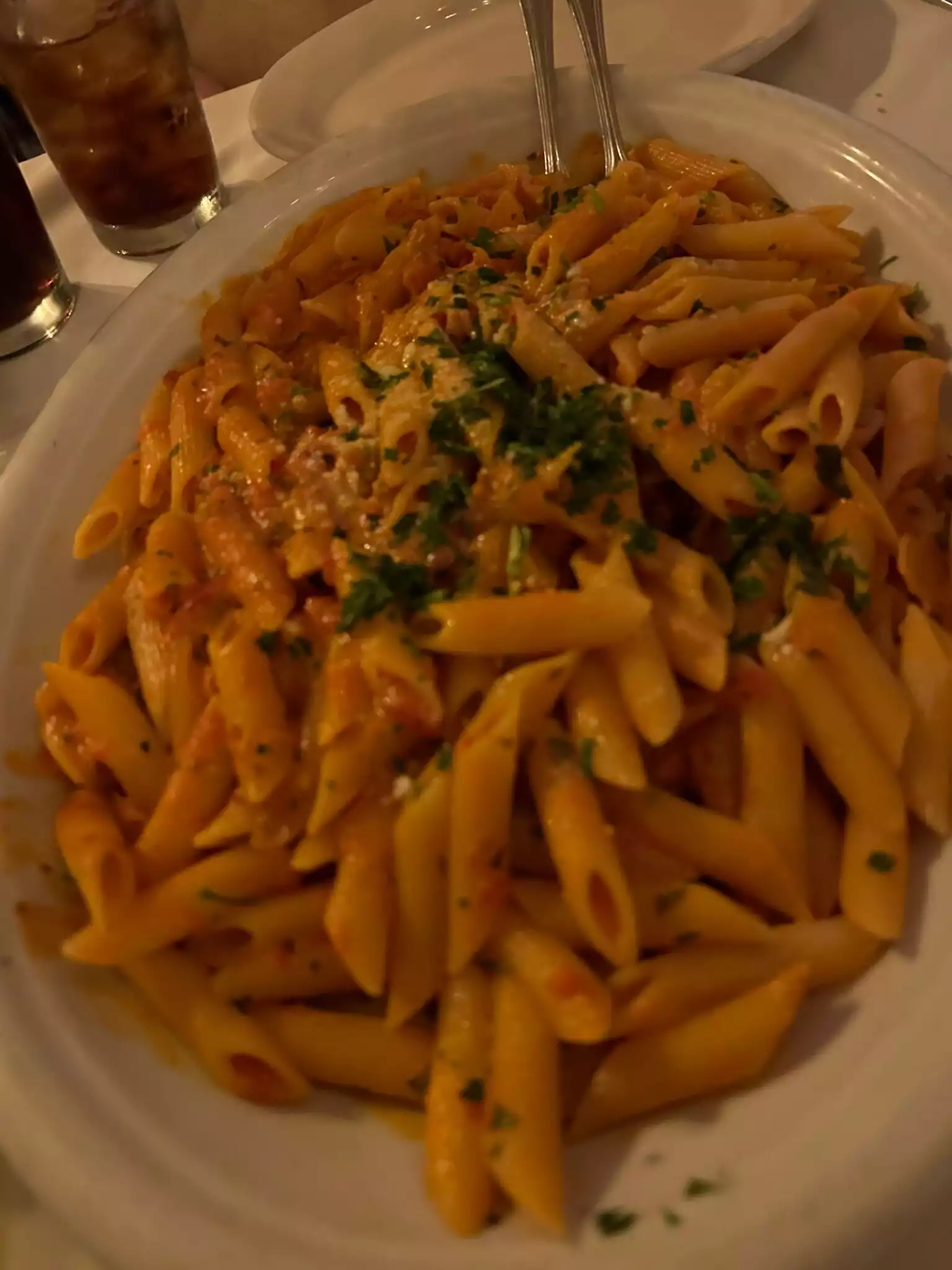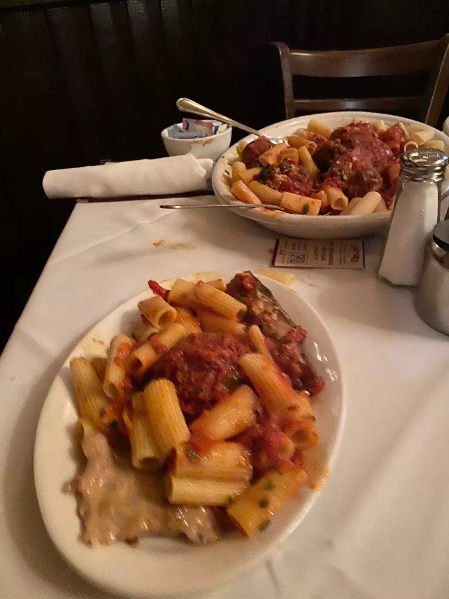My husband and I visited Carmine’s for dinner on a quick weekend trip. We arrived early for our reservation, to discover it had been accidentally canceled. Nonetheless, we were seated in the main dining room exactly on time after a seat at the bar. We drank the Italian Manhattan at the bar, and it was delicious. We settled on rigatoni and meatballs as our meal. All dishes are served family style. We did not get a salad, and we were happy about that choice, because the rigatoni alone could have fed 5 people. I also got a strawberry sparkler with my meal. It was fantastic, too! I can’t think of anything that could have made this meal better. Highly recommended. The servers were also extremely friendly and good. So glad we made this choice.
