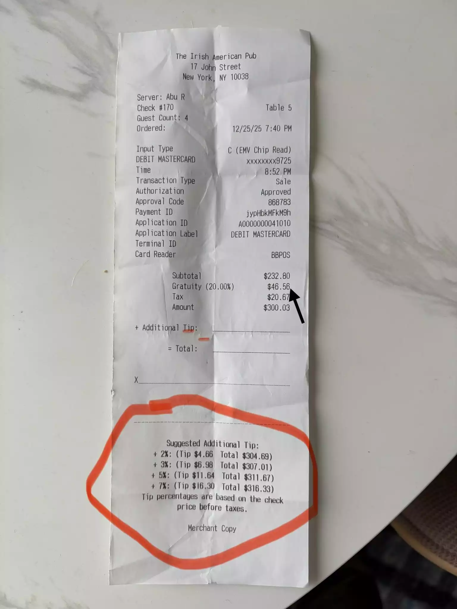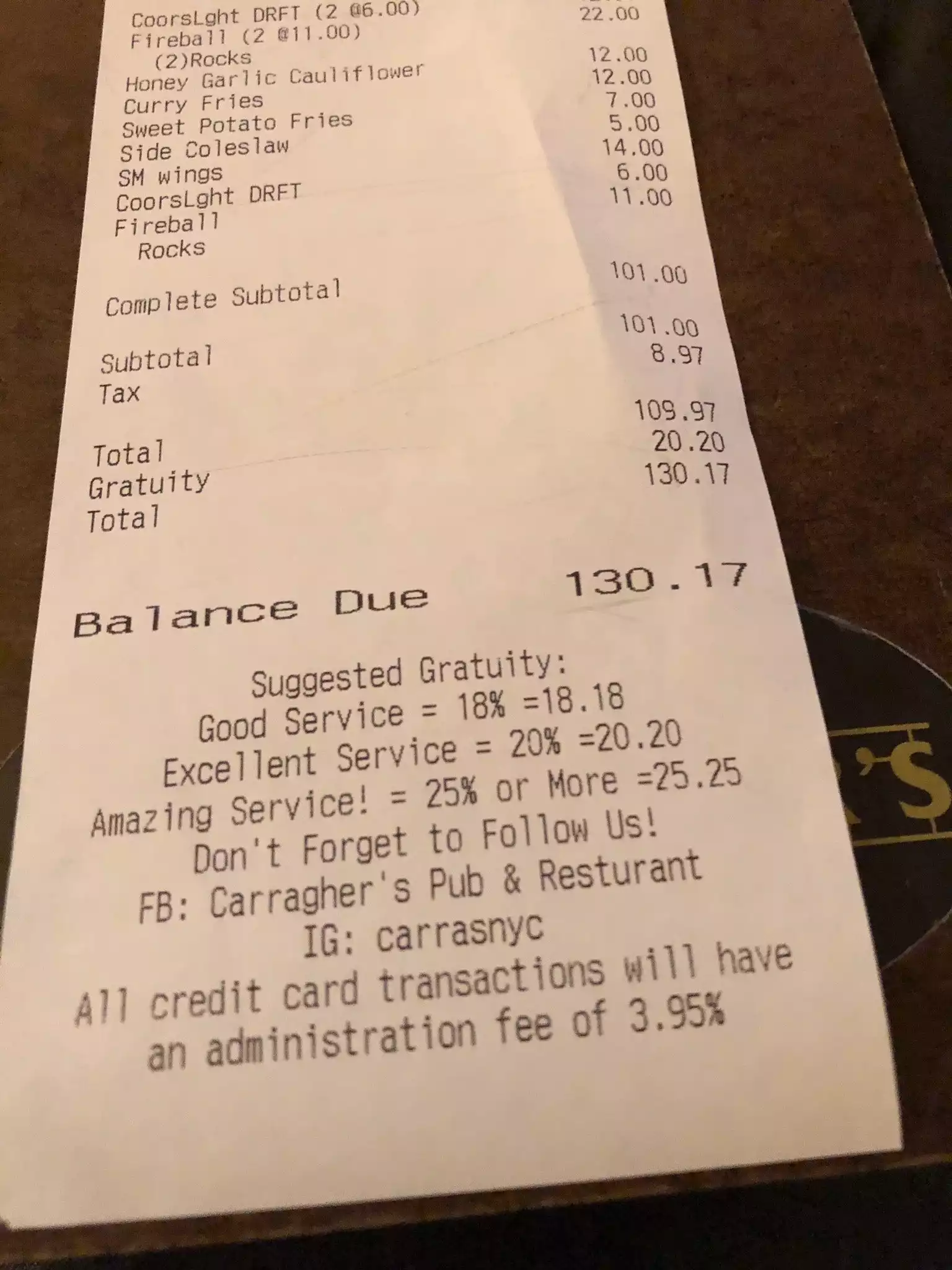 We are massive LFC fans and to watch Liverpool v Sheffield Utd game in Carraghers 23 bar in New York during our holiday was a deffo tick on our to do list. We were advised to book a table as the pub gets packed , weve been her before and in the “boot room” bar close to “ground zero” both bars are a must for all liverpool fans , LFC memorabilia is everywhere , I was like a child in a liverpool time machine. Anyway we were shown to our table , drinks quickly followed , a quick perusal of the menu - food was ordered and delivered , it looked great on presentation and matched up with flavour , the game started the place was packed , and we won 2:0 ( to stay 13 points clear with a game in hand over 2nd place leicester ) great footy banter with fellow LFC fans , plenty of singing , shouting , dancing , cheering it was a brilliant experience .......BUT During the match we enjoyed our food , and drinks then we asked for our bill still buzzing from our win we got the bill ,there was a 20% gratuality tip all ready added to the bill ( $20.20 to be exact ) We queried this saying the tip should be decided by the customer not automatically added , we were told the bill had already been printed at the till , i said i wasn’t going to pay a $20 tip. It took a bit of waiting but in the end the bill was changed. We have been lucky to have travelled to Las vegas , san francisco , LA ,and we have always been given the option of adding a tip not one that is forced on us. See the photo added on the bottom of the original receipt 🧾 the quality of service ( good , excellent and amazing ) increases in value - so the waitress scored herself a excellent not the customer. This TIP issue put a bit of a dampener on our visit to Carras bar , it’s wrong on many levels.