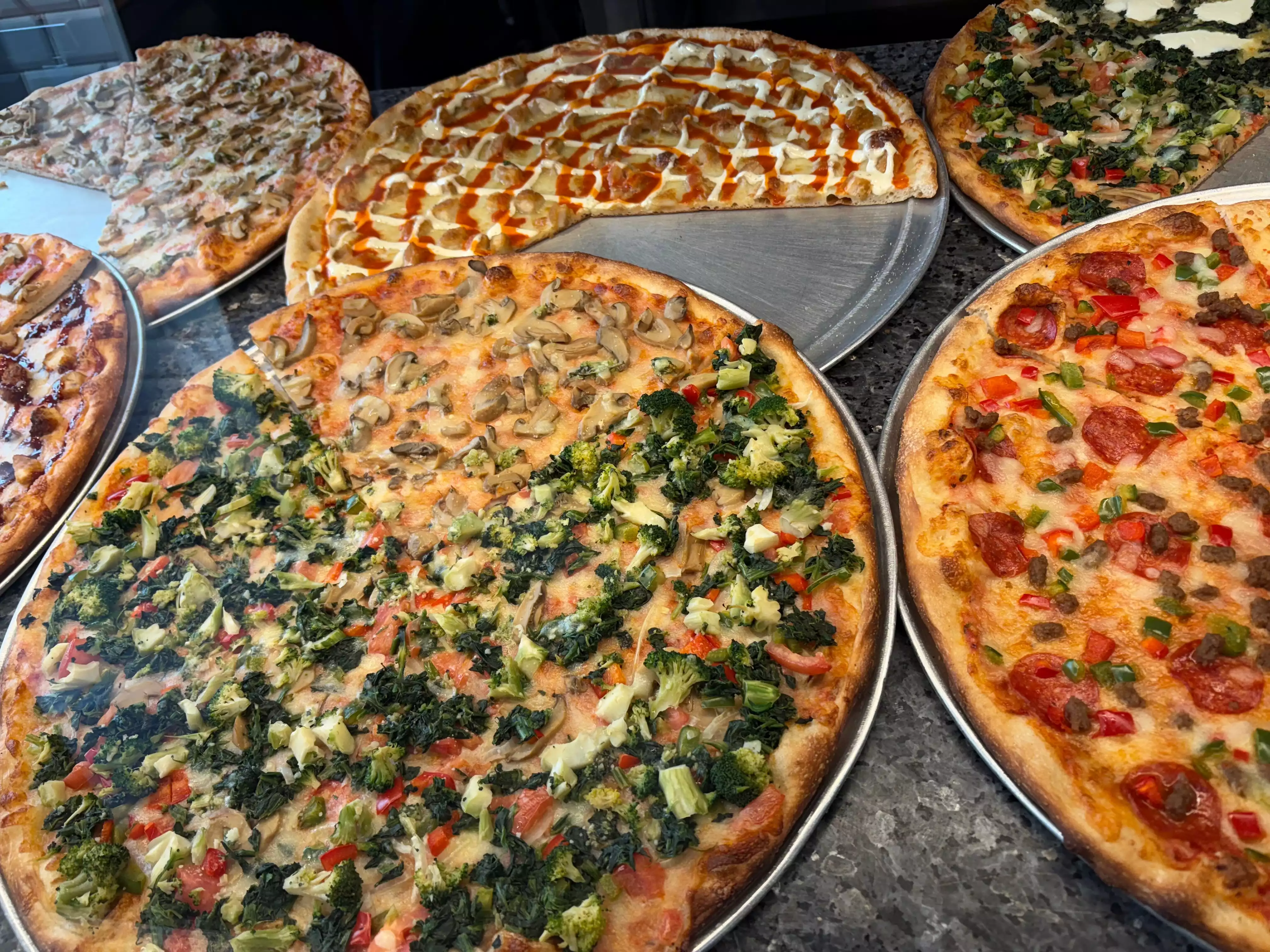 Huge pepperoni pizza. Steaming hot. Nice staff. Side of broccoli. Nice atmosphere. Helpful staff. Loved it. Large section of drinks and delicious desserts.