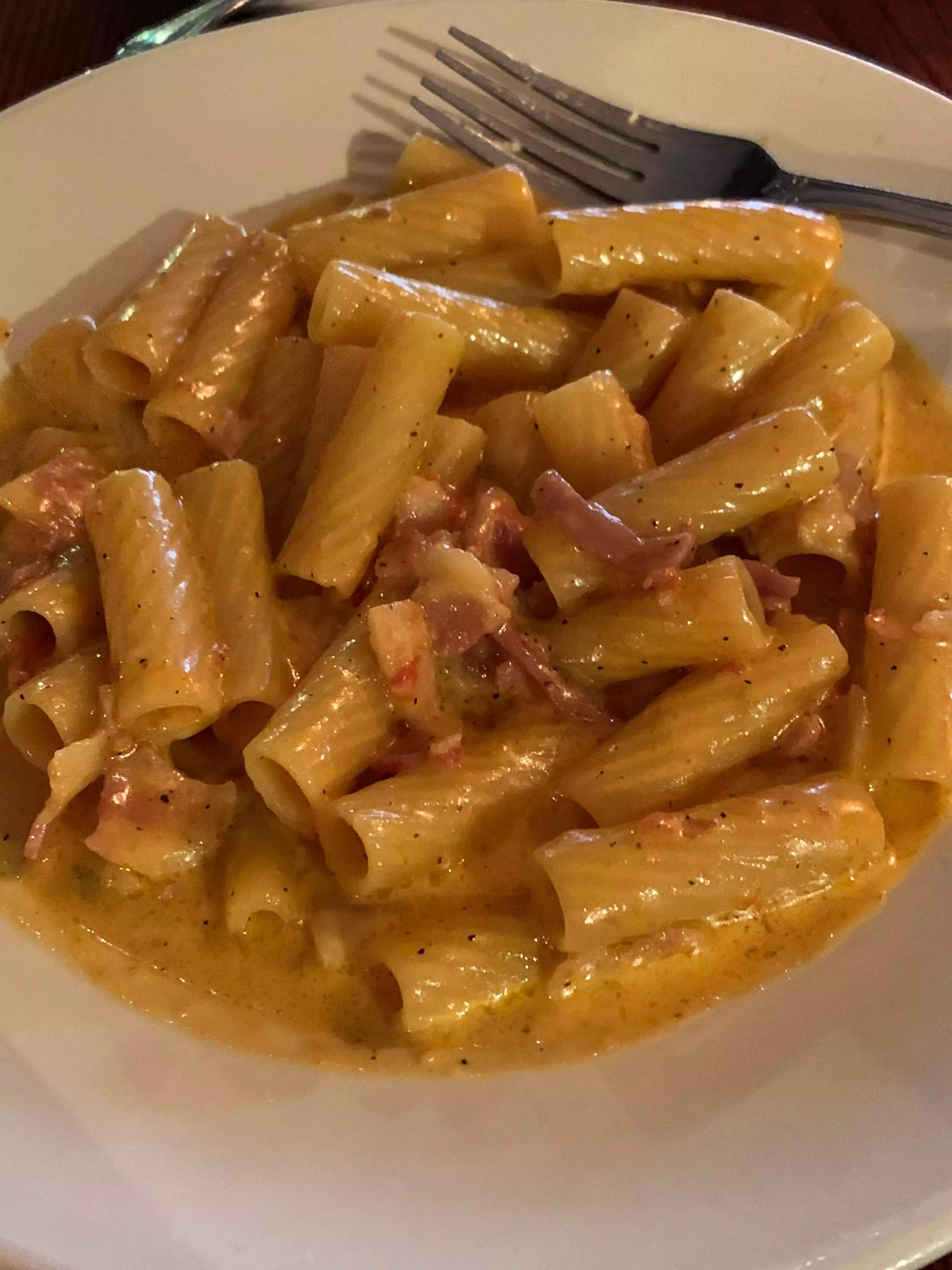 Ate here Sunday April 29th. We had time before our flight home,so, we had a late lunch here.One person had pasta Carbonara,I tasted it ,very good,and, served hot. I had Chicken Alfredo. Itb was delicious. Fresh white pieces of chicken in a home-made sauce,very tasty, The pasta was al dente. Done perfectly.. My sister had seafood pasta in a red sauce. She said it was good. For beverages we had beer ,and, wine.. They had a lunch special ,pasta and soup or salad for $15.00 The host Johnny from Albania was a "riot".. Nice time here...