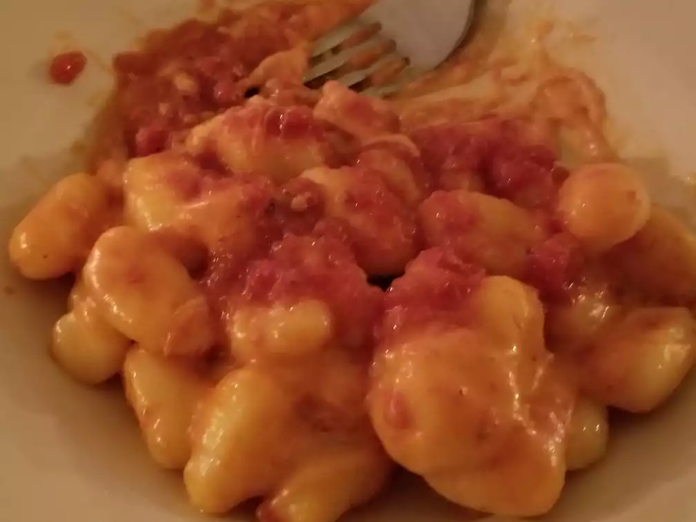 It was raining and we were hungry. The greeter in the street sucked us in with his clever recitation of just about everything on the menu. He made us laugh, so we went in. What a surprise! The place was full but we were seated right away. Service was attentive and friendly, and the food was fabulous. I was expecting a touristy experience, but instead I felt like I was in an old-world NYC Italian place. We shared a rolled and stuffed chicken breast with gnocchi in marinara sauce that was simply delicious. The gnocchi were like little clouds of heaven. We also shared an oriechietti with spinach and pine nuts that contrasted perfectly with the chicken dish. Very fresh and bright flavors. A bottle of house chianti was better than I expected for the price. You could spend a lot more money for something truly great, I suppose, but we were very happy with the chianti for $30. We had to practically beg for our check, so don't be afraid to summon your server. It seems they are happy to let people linger over their meal, but we might have liked a bit more attention at that point.