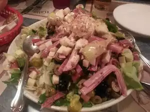 We have come here at least 10 times and the food is always fresh and delicious. We especially like the sausage pizza and the antipasto salad. The pizza is spiced just right and is so hot and fresh. The antipasto salad is packed full of meats, different kinds of olives, different cheeses and lettuce.