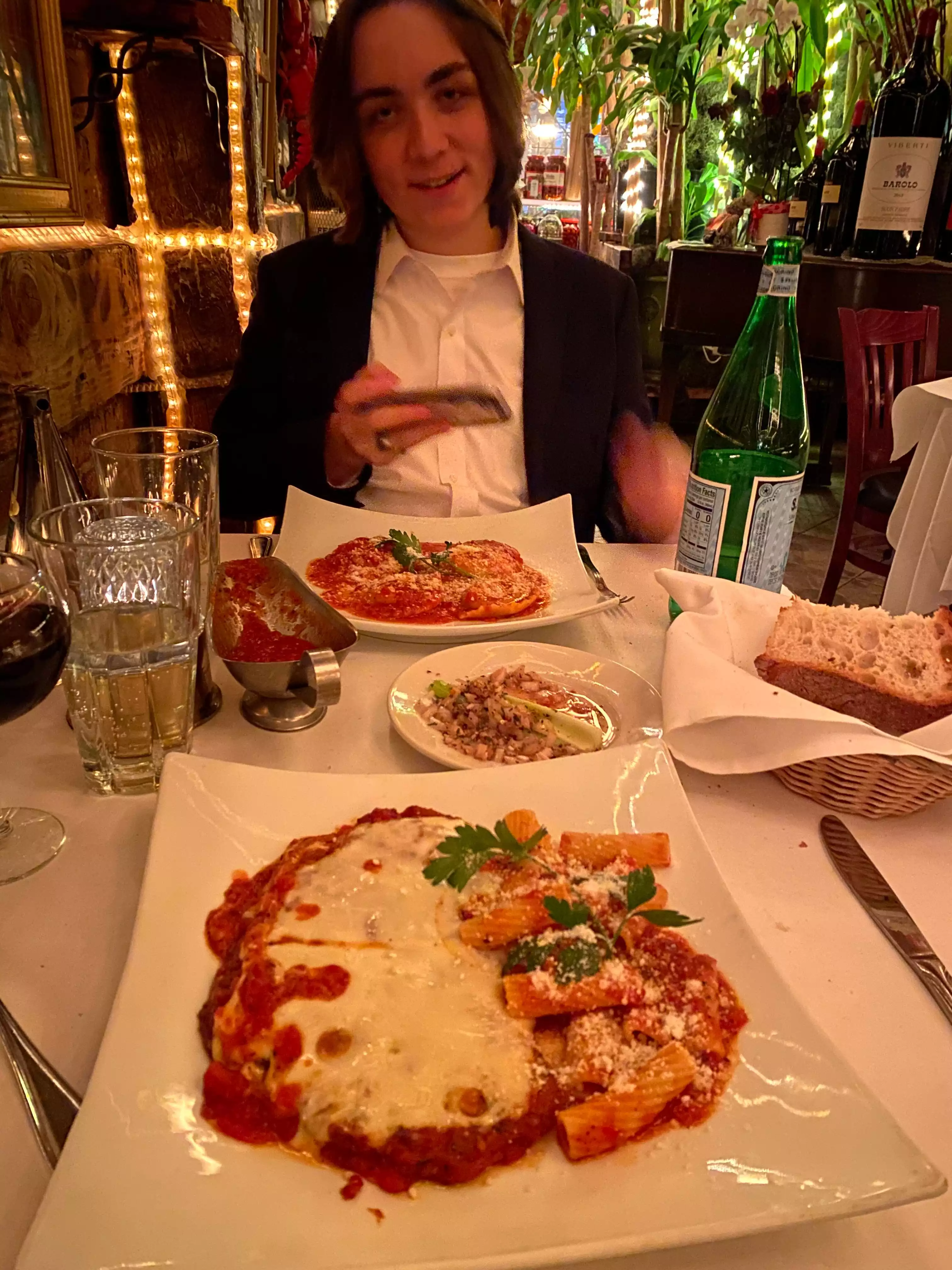 We accidentally found this delightful restaurant. while strolling through Hell’s Kitchen. The ambiance from the outside was compelling. It was an early dinner for us. we were the first customers and we loved the interior as we walked through. The wait staff was very attentive. The music was a little loud but with our request, was turned down. Did I mention the music was Elvis! Later, we found out that Elvis is the last name of the owner. The lasagna Bolognese was fabulous. My partner had the spaghetti carbonara, which was the best we’ve ever had. Terrific bread with a dipping oil with cooked onions and herbs. With a glass of wine, it ended up being a reasonably priced dinner. The owner showed up, and after we chatted with him, handed us a bottle of wine as a gift with a personalized label! We since learned that he had planted grapes in front of the restaurant many years ago, and they are producing! This is definitely worth a return. Ambience alone is a 12 on a 10 scale.