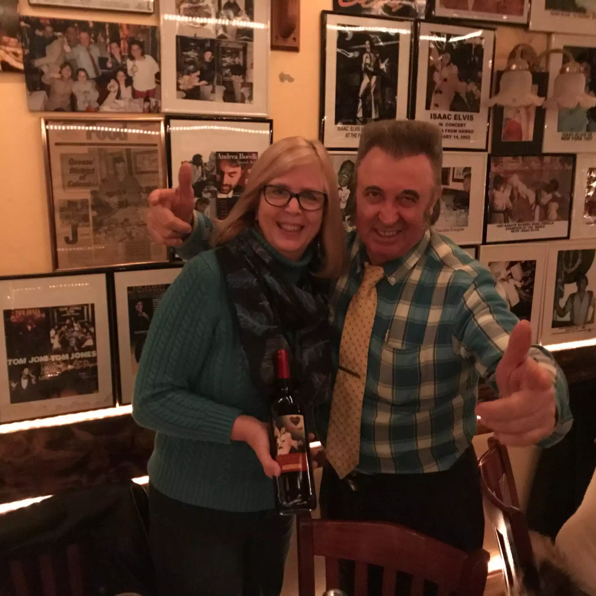 So I found this little Italian restaurant and the food is absolutely awesome! But when we walked in, I noticed an older man in the back with 70s Elvis sideburns. As we were eating, I noticed every song on the sound system was either sung by Elvis or was a Elvis song sung by someone else. Started to see a pattern. Noticed a framed autograph picture of 60s Elvis on the wall. Got up to check the photos hanging on the wall, and it quickly became clear the owner was an retired Elvis impersonator from Vegas. So told the waiter we were from Mississippi and I worked 25 miles from the birthplace of Elvis and shortly thereafter, “Issac Elvis” came to greet us, took a picture with an Elvis pose and game me a commemorative bottle of wine with his Elvis impersonator photo from The Flamingo decades ago. Oh, the Places You'll Go!