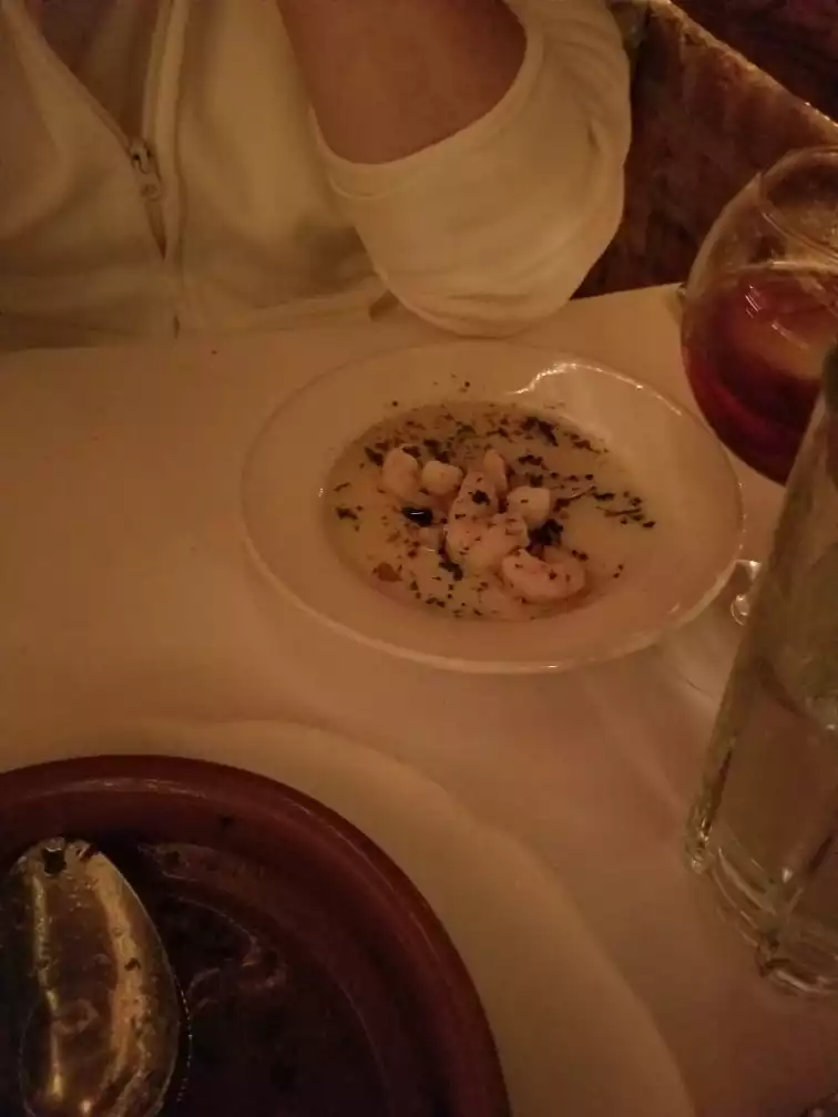 Ordered the octopus appetizer which was a special and not on the menu. The waiter came back to the table after taking the order to make sure we wanted it since it was $50, which I appreciated since that changed my mind. We had fried calamari instead, which was disappointing because it was large, chewy calamari rings, with no tentacles. Ordered the house wine, which was a cheap Tempranillo and okay. The problem was the half carafe was $20 (good deal), but the extra glass we ordered was $14 (terrible deal). The prices weren’t on the menu so we didn’t know until we got the bill. The menu is extensive, but totally lacking descriptions. I guess we could have asked. The veal saltimboco was made with spinach, which my husband wouldn’t have ordered if he had known. I ordered risotto with squid ink, which was tasty, but the risotto wasn’t all that well prepared. I really wished I had gone for a pasta dish instead. I was glad I had read a few reviews and was forewarned about the 20% tip already being applied, because it’s not mentioned in the menu or by the waiter. The restaurant itself is lovely and a little quirky and very cozy. I would go back and order differently, but, unfortunately, my husband isn’t in agreement.