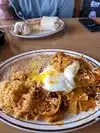 Was dying for a Mexican breakfast when in town and I enjoyed the meal. The hostesses and servers were all so friendly and positive. My huevos Mexicanos was good, but my critiques would be, scrambled eggs were over cooked, so I will request them to be more lightly cooked next time. Now this critique will be a plus for the majority of the population I realise, the refried beans had too much bacon flavour/fat. No one else will mind I’m sure ;-b And my last critique, Why did an omelet come with pancakes, lol. We each only have one tummy. Again, I know some people would like this very filling treat. Will visit again.