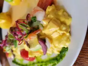 I have been very sick with a cold, but needed to get into the outside world. I decided to eat brunch at Casa Zoraya because I had read such praise from the Willamette Week and Eater PDX. On a very cold day I came into the restaurant as it opened. I was the first one in but the wait person told me that a large party was being held and the only room for me was at the bar. I was fine with that. I sat at the bar reading a book. To start I ordered a coffee and a Chicha Morada which is a drink made from purple corn. It is delicious to the taste and highly desirable. I recommend you try it. I then ordered what is called, Jalea Mixta, which consists of the fried seafood of the day, potato, yucca in replacement of the plantains which they were out of and salsa criolla. I was worried about the yucca because I had tried it before in a Cuban restaurant where it was boiled and extremely bland. The waitress swore to me I would like their version of yucca and she was correct. The entire meal was perfectly balanced and had tiny tomatoes with perfect acidity and these wonderful slivered onions that were amazing. The seafood was fresh and perfectly prepared and even with the cold I was suffering, the flavors were bold and delicious. I have to say this is one of the best new restaurants in Portland. The chef knows how to prepare a great tasting dish and the visual presentation is amazing as well so if you have a date or special occasion this would definitely be the place. The only thing I lament is that I forgot to photograph the meal before I ate it. A mental mistake brought on by the cold I have. Regardless, I highly recommend Casa Zoraya!