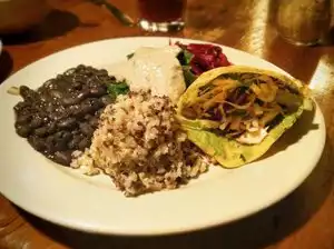 At Casa de Luz, everything is organic, vegan and gluten free. Many of the ingredients are locally sourced as well. The set menu for the day included cabbage and mushroom veggie soup, veggie tacos, and a salad made of purple cabbage and lettuce. Sides for the tacos were black beans, blanched collard greens, pickled beets, and a brown rice medley. The GF tortillas were outstanding and didn’t fall apart when handled. The taste and texture was spot on as well. The taco veggies were fresh and tender. The 2 ingredient salad was basic and arrived with the vinegarette dressing already applied. The black beans were yummy, as was the sauce topping. Overall, Casa de Luz uses super clean ingredients and cooking methods, serving clean and healthy food at a reasonable price.
