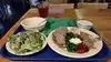Very organized, vegetarian soup salad and plate. It was very calm, nice music, and views. Every day there is a different soup and plate. You pay first then get drinks, soup and salad. They bring your plate of veggies, beans, etc. Very tastey and good amount. All was very delicious, and would like anything they serve.