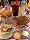 Retro vibe. Great burgers and fries. Milk shakes were good, disappointed they were out of vanilla ice cream on a Tuesday evening đ«