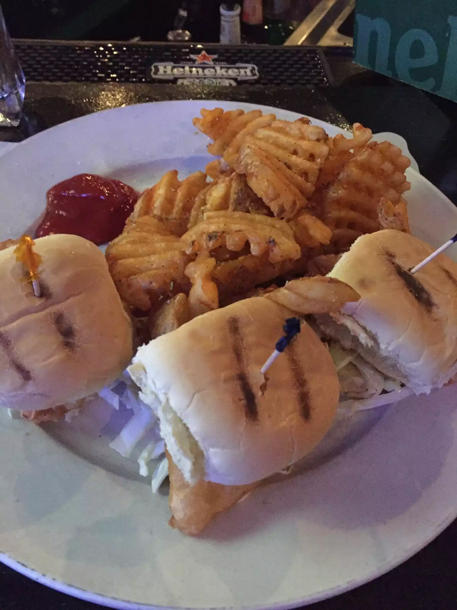 Stopped here after work for drinks and dinner with friends. Dined at the bar; beer was cold and bar tender attentive and friendly. Decided to stay at the bar and nosh. Ordered the jalepeno poppers and the fish (COD) sliders. They were amazing; the fish was cooked perfectly, crispy and hot served on toasted slider buns with coleslaw tucked inside. Served with fries, this was a dish I had never tried before and now would seriously return if it was not a flight away. Oh, and ordered an Irish coffee to cap off evening. Good!