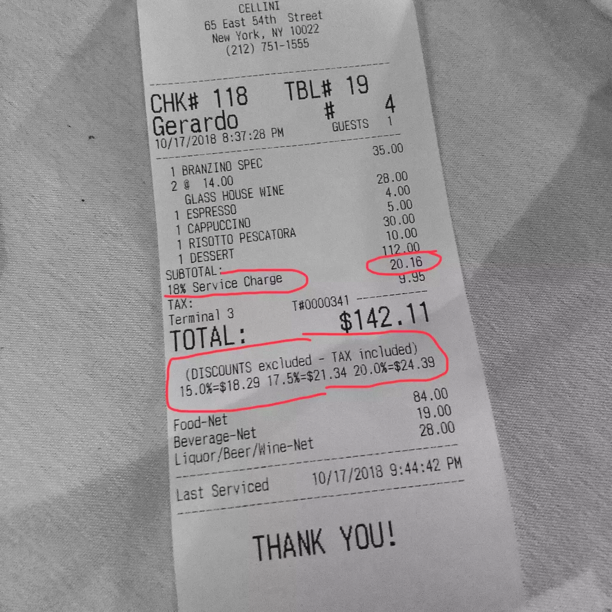 Food is great but expensive...we've dined here many times and this is at least the third time this has happened (at least the third time we did not catch it!)....we're just a party of 2, but very often the gratuity is included; it's been our mistake but we've tipped on the tip. We realized this happened again just this week when we paid in cash and only the change was given back without the receipt! Unfortunately we won't be back anymore.