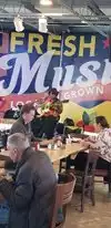 Can get busy, but good food, beer options, free early music several days a week. Tons on parking. Be as good or indulgent as you want with cafe menu...pick up stuff at the adjacent hot and cold food and soup or salad bars as well.