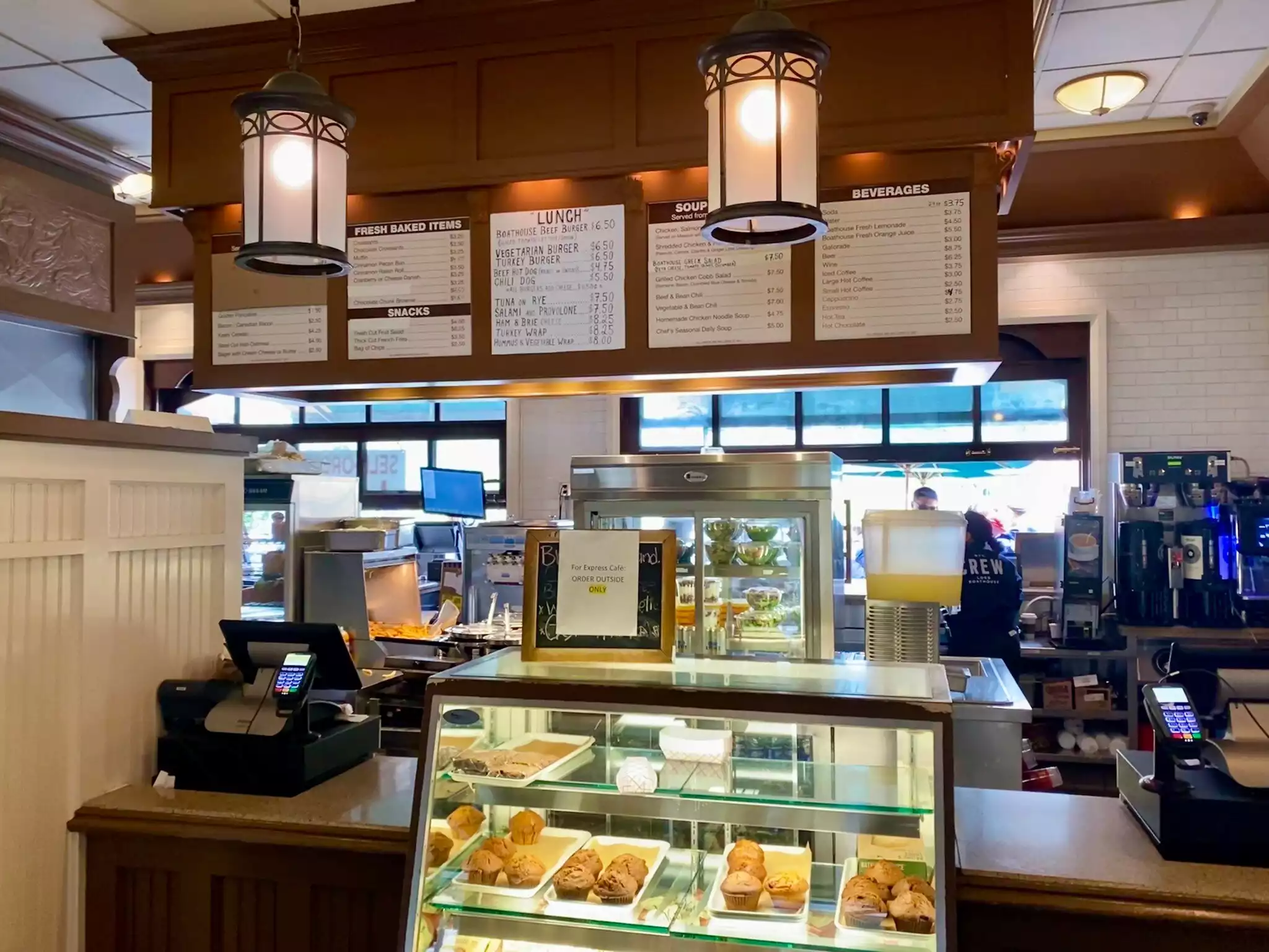 In full disclosure, we did not eat a meal at the Boathouse but had coffee and sat outside. It took a while to get our two chais, but the weather was nice and we enjoyed sipping them while people watching at the outdoor tables. Taking a look at the food menu in the main dining area, it looked like it was more expensive than what we would have paid for lunch so we skipped it. You can also use the public restrooms and walk around the grounds.