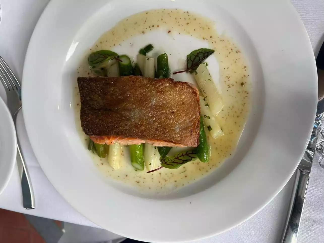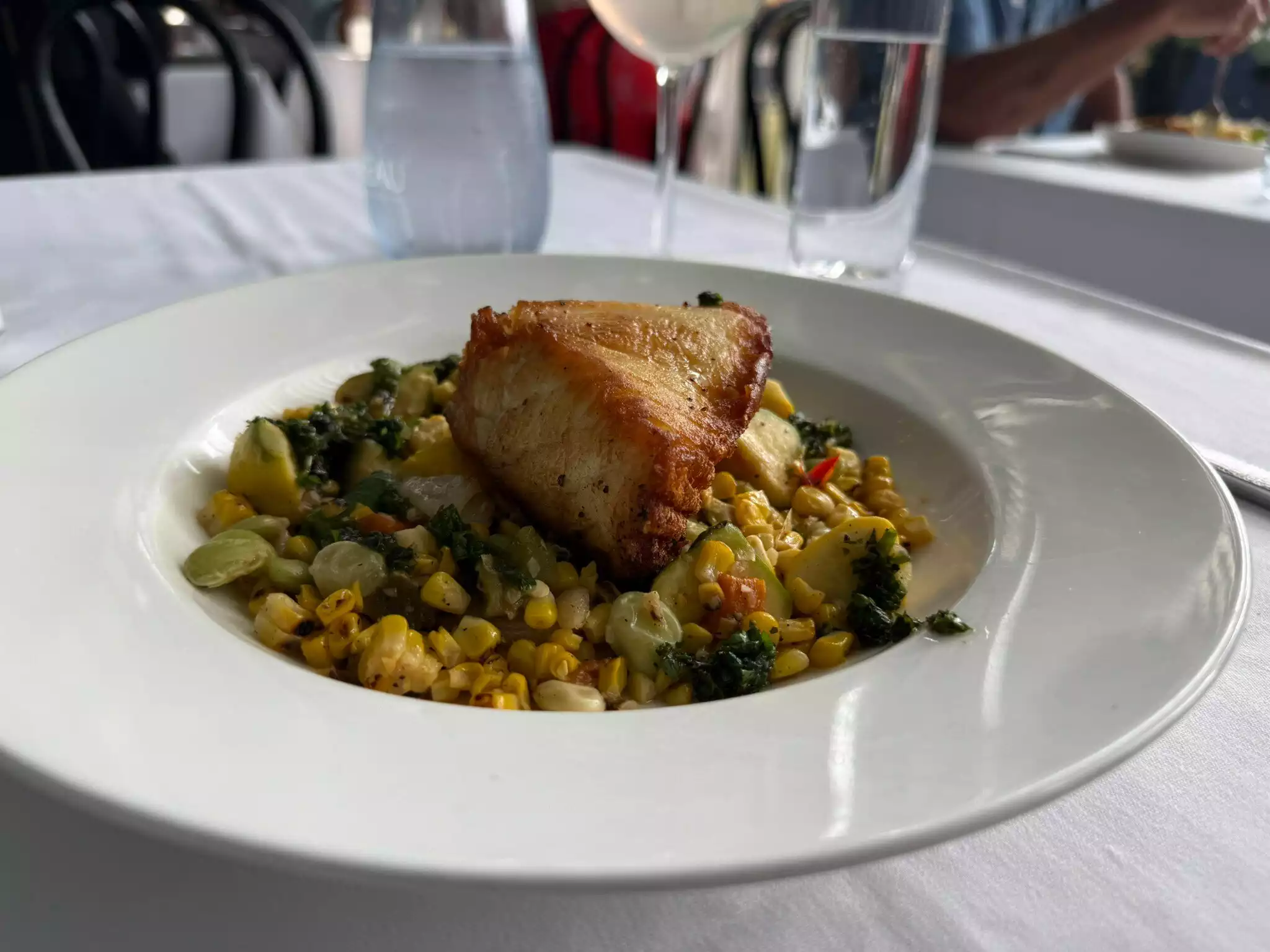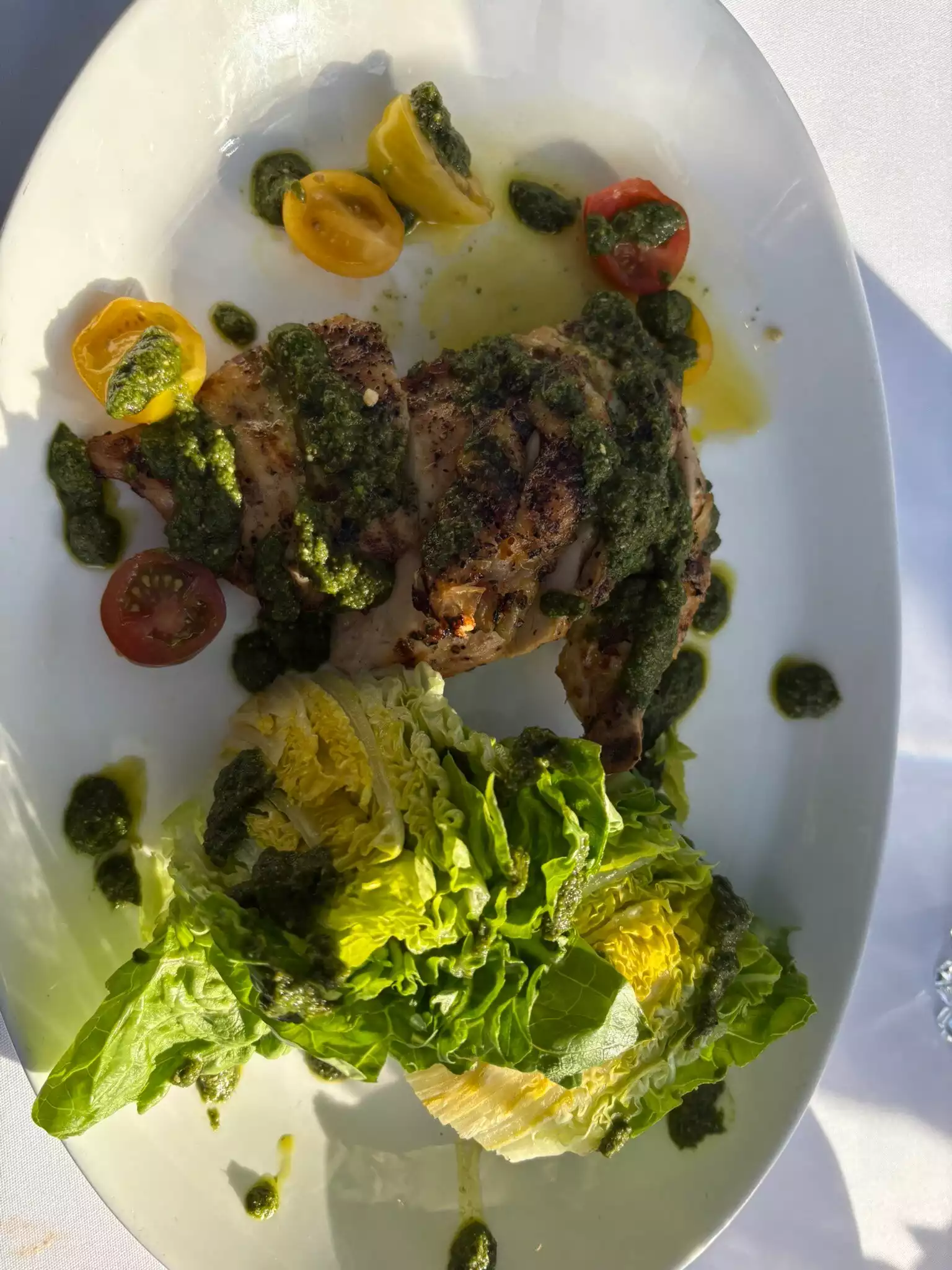 This is a lovely restaurant with very good, if pricey food. Excellent service. We had swordfish and trout both of which were very good. Excellent starters including a generous crab cocktail and superb mozerella salad.