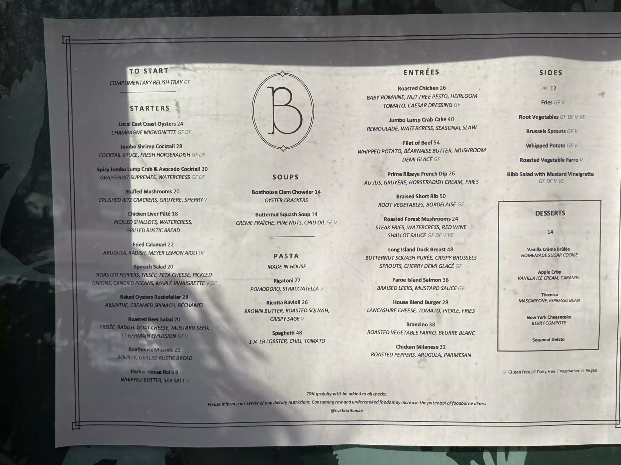 Had dinner and we were in a hurry otherwise we would not have left without bringing all of this directly to the managers attention: the bottle of water was TEN dollars (really!?), we were offered bread for the table (normally complimentary, right!?) without being told we would be charged for it (to the tune of NINE dollars!) and a gratuity of 20% was automatically added without being told (seriously!?)= ONE HUNDRED and FORTY FOUR DOLLARS (WITHOUT the 'accidental' 20$ tip!) for water, bread, 2 entrees (which were actually quite small…), a desert (also small at SIXTEEN dollars), she only had water, I had an Arnold Palmer (another SIX bucks): no alcohol and no appetizers... Suffice to say, once we really looked at the bill we felt completely and utterly ripped off! Just plain thievery. And im a NYer used to high prices! Look, I know the Boathouse has had some recent troubles but the way out of those troubles is not to deceive and cheat people FFS. And btw: we had just been on the row boats and the oars were almost all busted and most people were being forced to use little paddles!? Thats just low rent, mediocre BS. The Boathouse has a very long and distinguished history and I, as Im sure many others do, consider it a centerpiece of Central Park. This is New York City, man! Show some sophistication and class or go the f*ck home.... I used to really enjoy dining there but I WILL NOT be back.