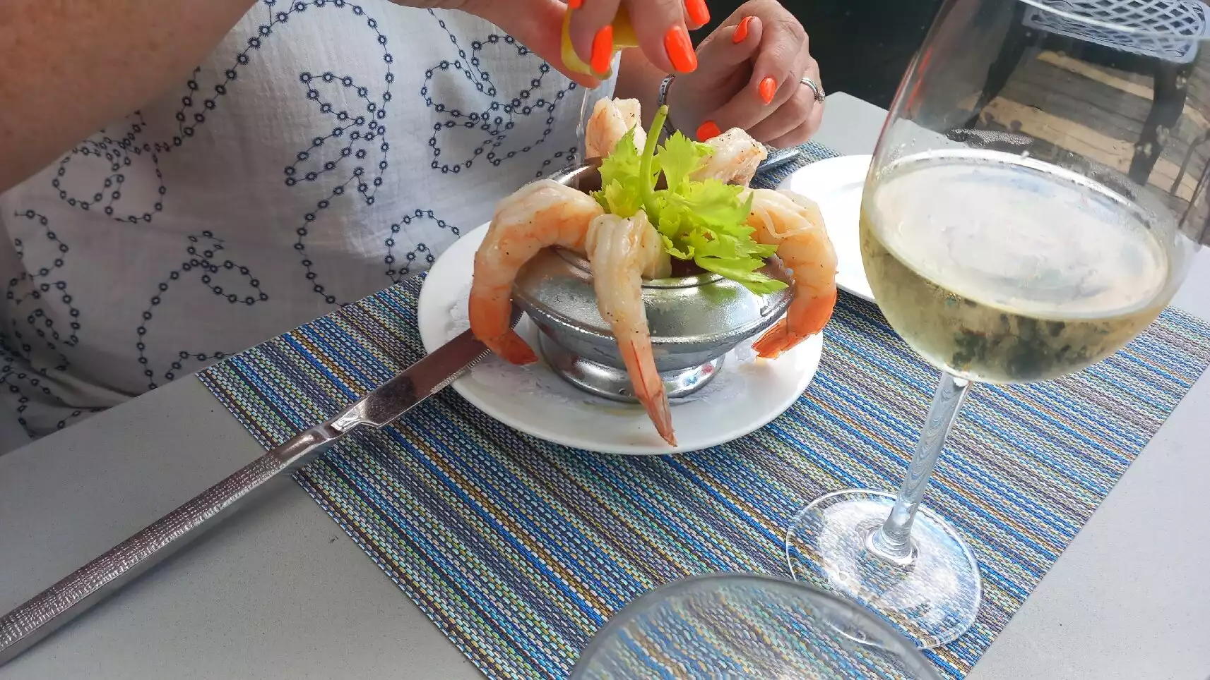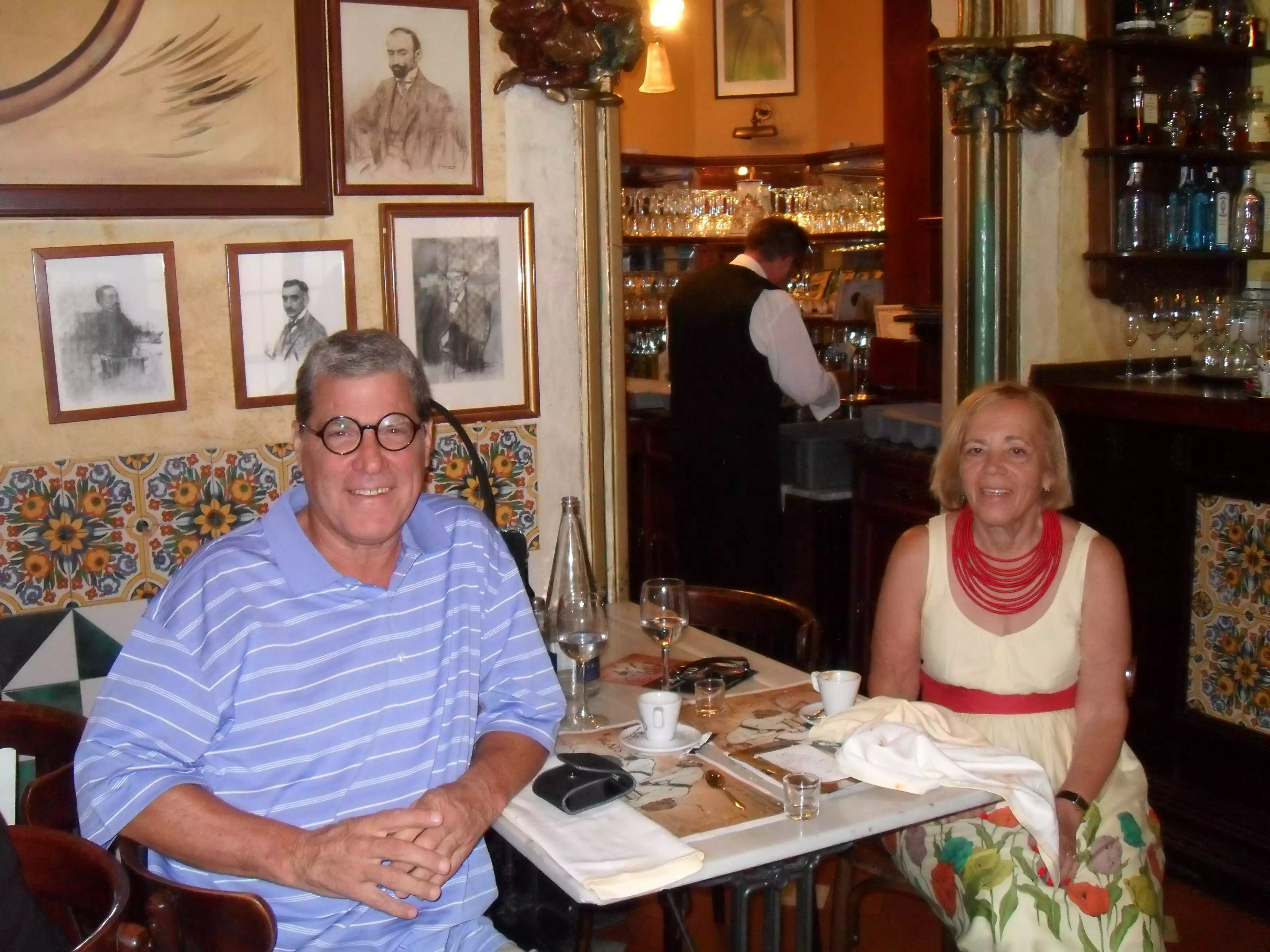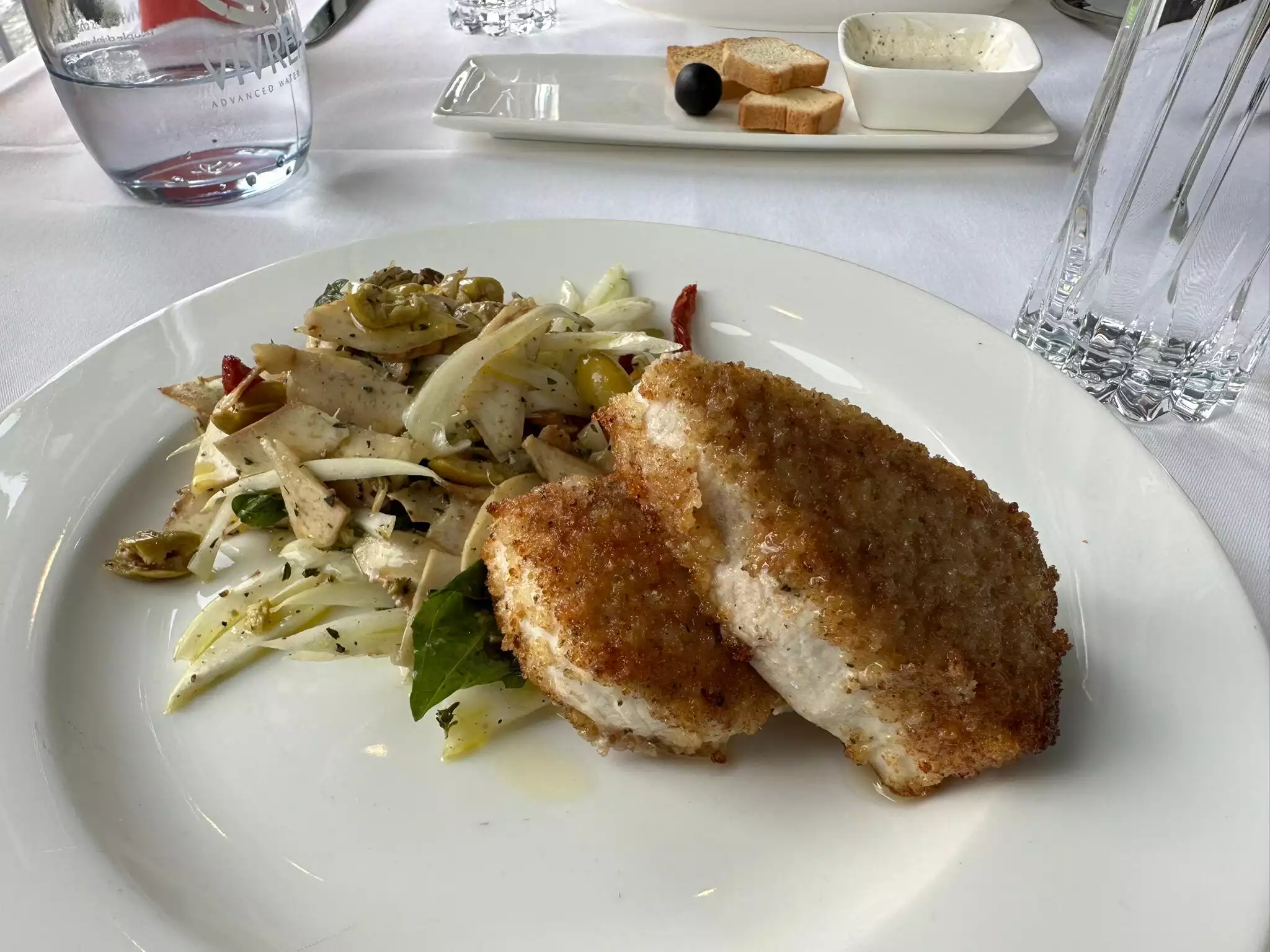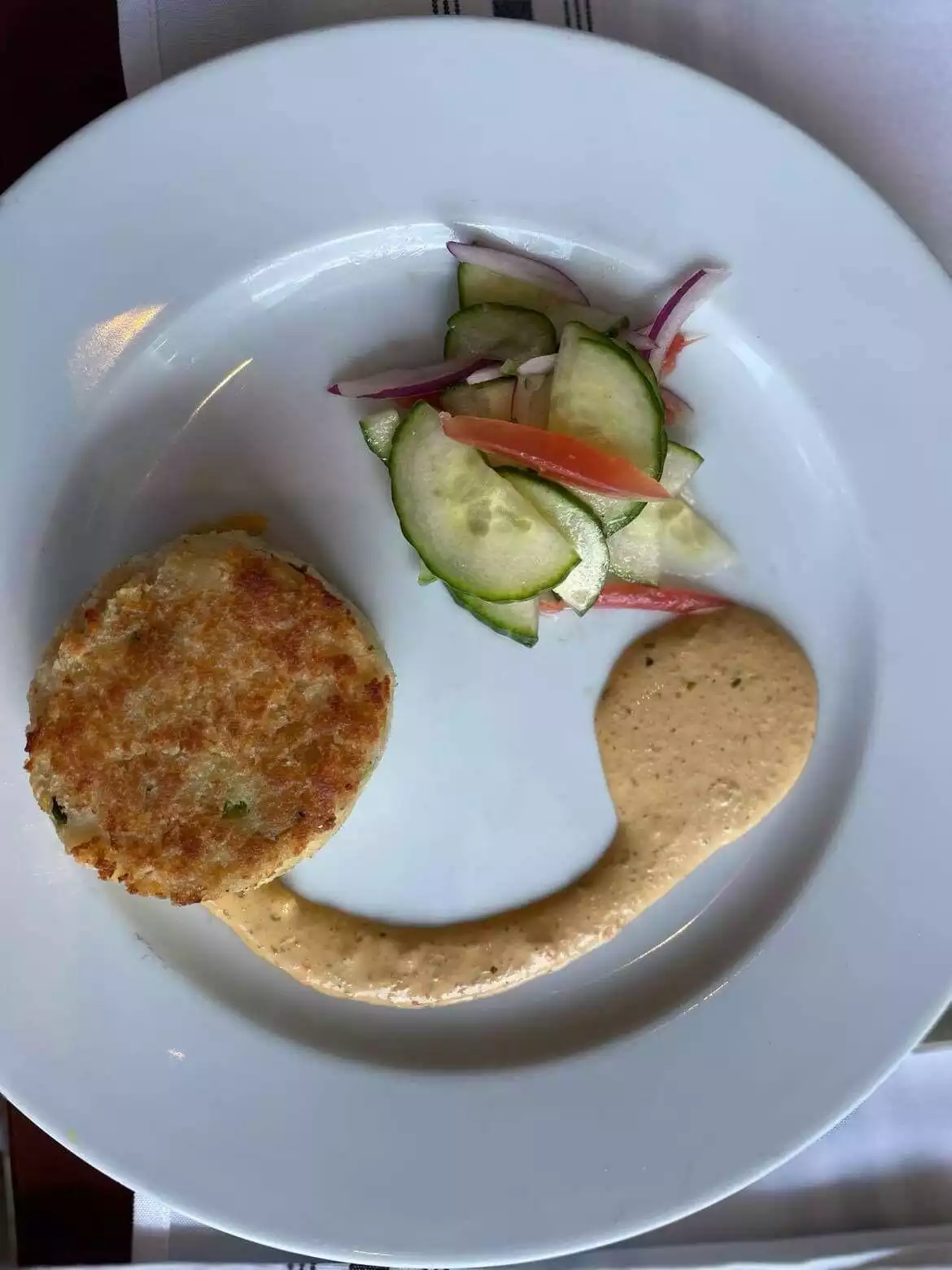 Mo was our waiter and he was excellent, suggested a rose glass of wine which did prove to be dry and excellent. My friend had crab cakes and loved it. I had the chicken Milanese which came with a salad . One piece was moist and delicious but the other piece was somewhat dry and overdone and I needed to ask for olive oil to add to it to make it edible. The view at the window table was wonderful and the jazz music was soothing after walking in 95 degree weather. This is fun for a one time experience but I feel other places for gourmet food might be elsewhere. I did appreciate the excellent service we received.