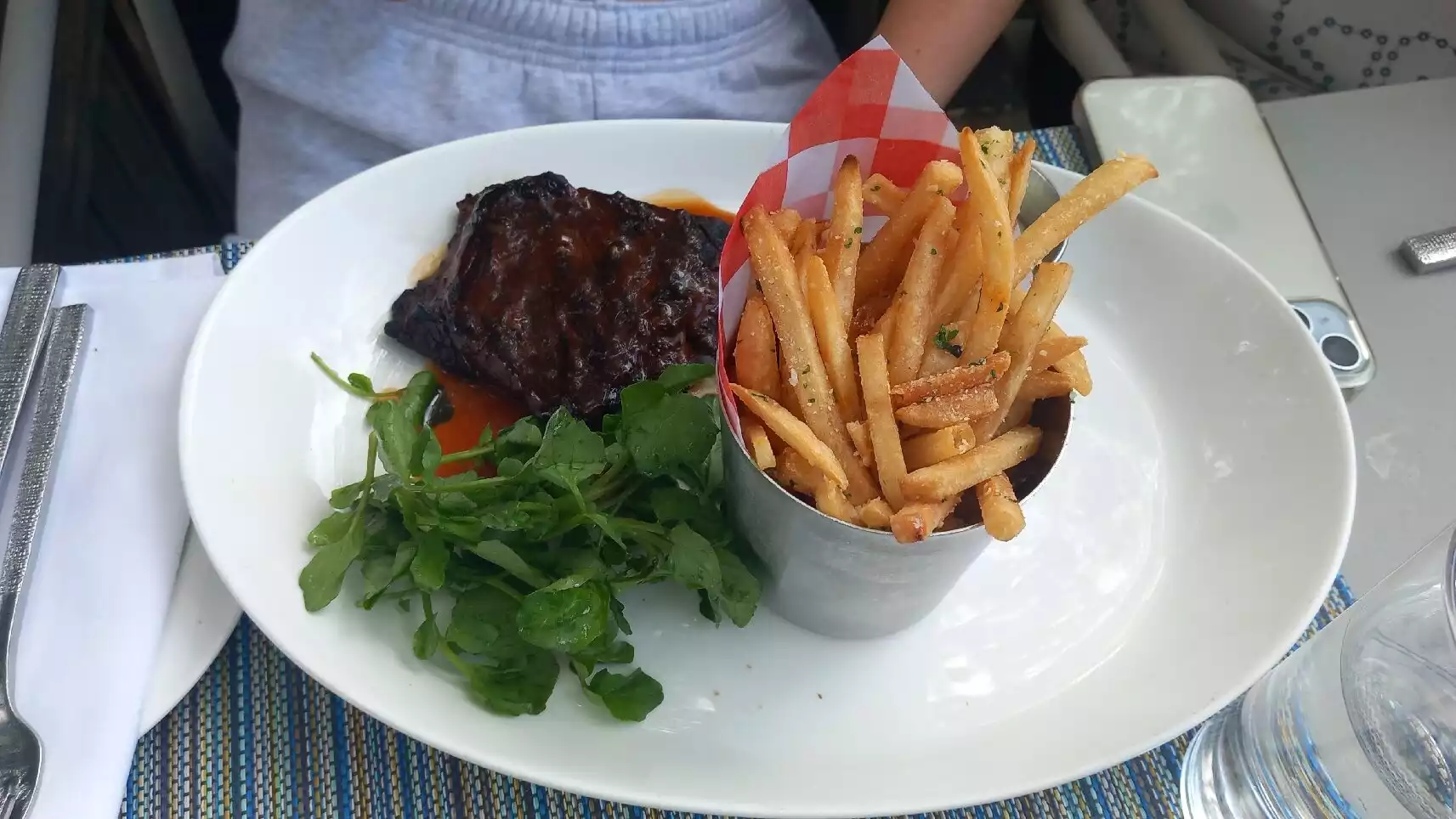 We walked in and were offered a table which wasn’t immediately next to the water but still had great views of the lake. The food was ok, I had the traditional Benedict, my husband the quiche and the kids had a burger each. They were chuffed all the extras were on the side so they could add what they wanted to it. Quality was ok and yes it was expensive for what it was but the views (and a/c) made up for it. Service was over the top for us brits, but that is probably ok for Americans!