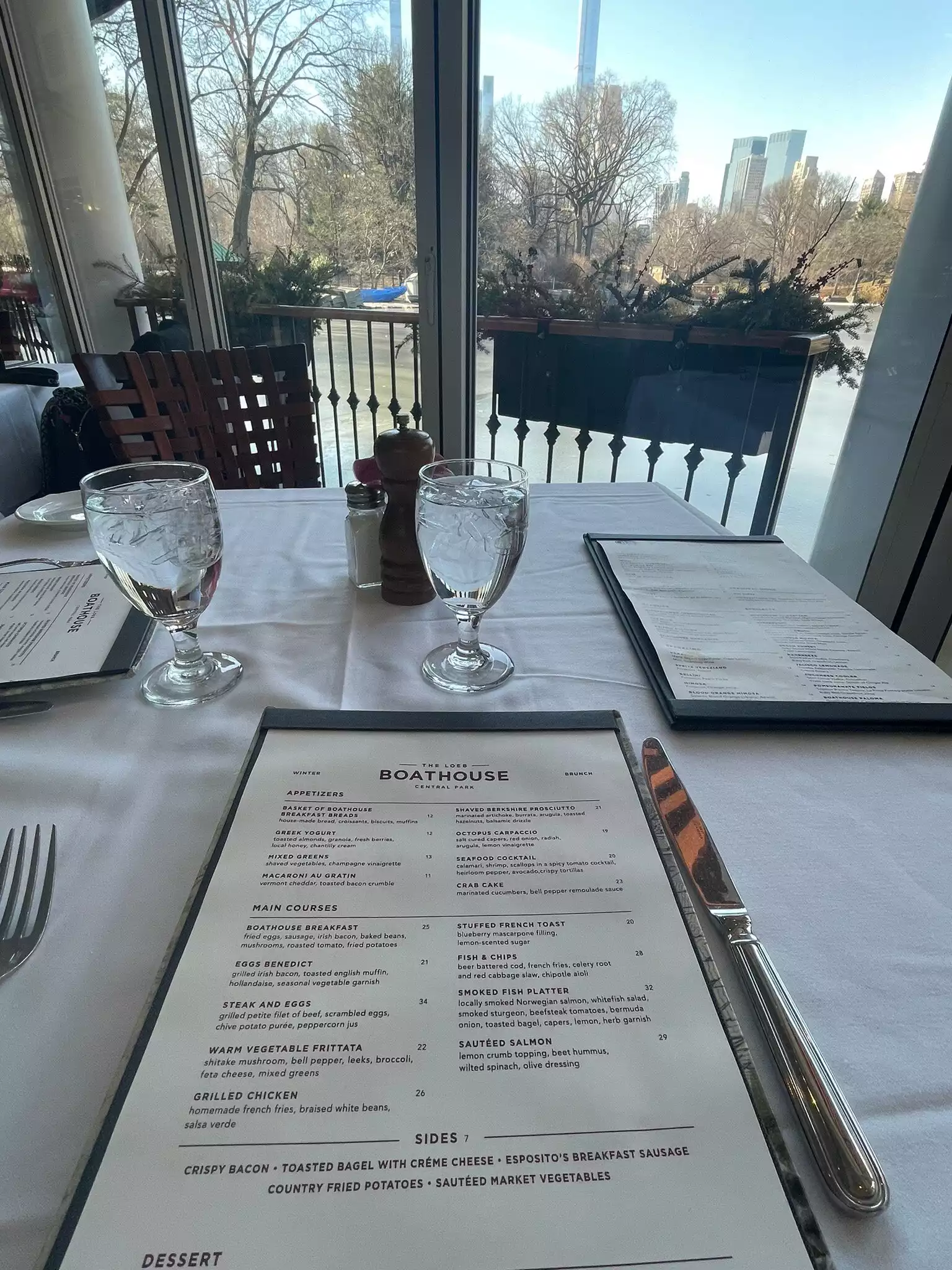 We visited at lunchtime midweek, without prior reservations. The sun was shining on compacted snow, almost “deep and crisp and even,” making for a picturesque view outside. The weather was cold outside, in Central Park. But the welcome we had within was definitely very heartwarming. The menu looked inviting too. Chicken, salmon, steak and mussels… For a visiting Brit however, the absence of lamb and pork appeared significant. That did not detract from the varied food on offer. All served promptly and with aplomb. The staff were most considerate. Nothing was too small for them or not worth the effort. Food was cooked to perfection. And served in style. Certainly a superior eating place!