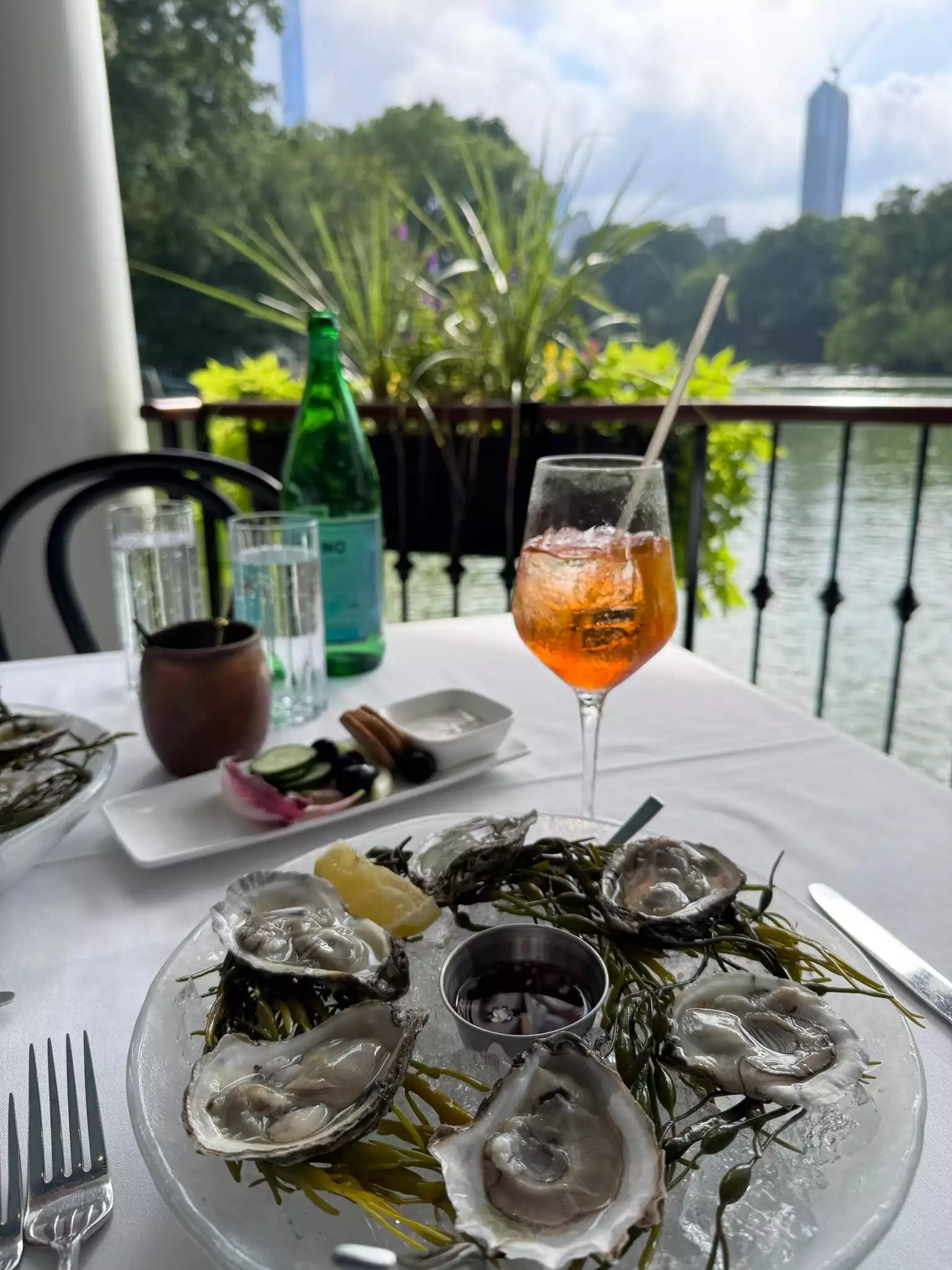 Beautiful view. We sat at a table right by lake. Hostess and wait staff were wonderful. Food disappointing. First the bar does not stock dark rum so we couldn’t get hurricanes (aka dark and stormies). This is NYC and I expected better. I drank ginger beer no alcohol. Complimentary Relish tray is sweet gesture. We ordered stuffed mushrooms and oysters Rockefeller to start. They were ok. We shared an order of spaghetti with lobster. Described as house made pasta, the pasta was very dry, the lobster was fine. For these prices you are paying for the view, not food of high quality.
