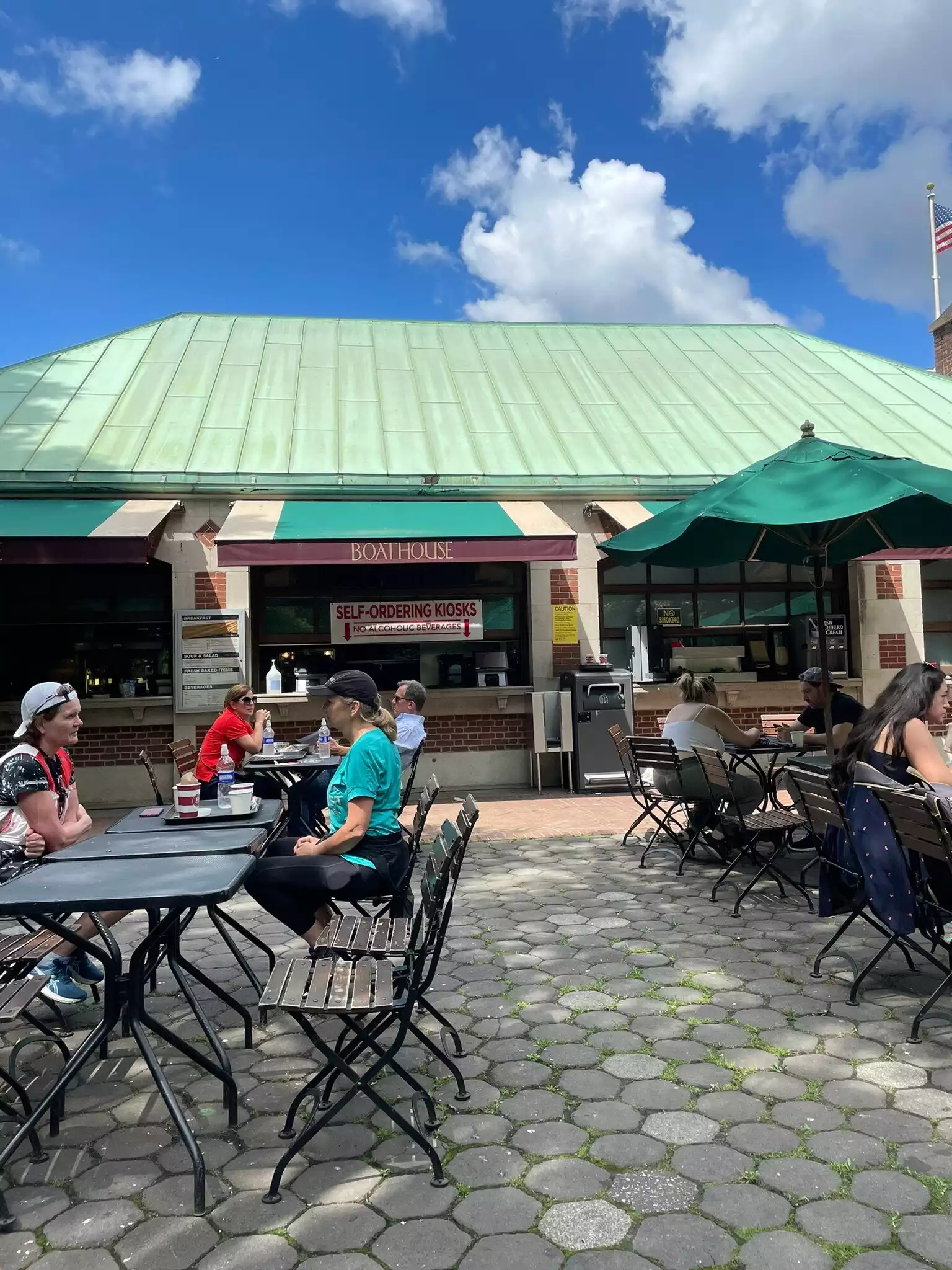 We ate at the cafe at Central Park Boathouse on a Sunday afternoon. There was a short line and then you order at the counter which is also where you get your food when it is ready. We would have preferred the interior of the restaurant overlooking the water but the menu is very different and much more expensive. Even at the cafe our meal for 4 was around $100 but our kids liked the selection better. It was a beautiful day and we enjoyed our time eating in the park.