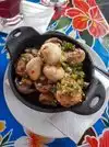 Seafood Paella with almost no seafood but a lot of chicken and sausage? Olive from a jar I can find in a grocery store and rice who taste the same thing as the one in a can? For 17$ (the small plate), I think it's a racket. I was sitting at the bar, nobody ever asked me if I wanted something else, and it's so dark! There is no lights.