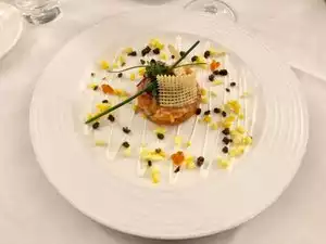 We ordered the three-course menu, starting with the trio of salmon. This was the best course of any meal we had during our five day stay in San Francisco. The salmon was surrounded by chopped hard boiled egg and caviar. Scooping some of the salmon along with the caviar and egg caused an explosion of flavor in your mouth. Superb. We followed that with the braised lamb shank which was very good and extremely tender. I had the profiteroles for my final course and what I really loved was that the chocolate was not too rich. My husband had the baked Alaska which he also enjoyed. We would definitely return.