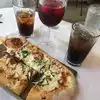 Because of the prime location and tiny space, it's often packed and service is slow. Just go on an off hour and you're cool. Brunch or happy hour time is perfect. The waitstaff was cute and attentive, but unobrusive. Sometimes inconsistent, but stick with their sandwiches ( fish, turkey, brisket, pork), the Mediterranean plate (a bit onion-heavy), salads or soup, and it's solid yummy goodness. The rigatoni with sausage/mushroom and cream sauce is pure decadence. It's rich and heavy but so worth it. I ate half and took the rest for the best leftovers ever. Pizzas aren't bad, but not great. A fun place for casual drinks and a bite to eat. Fun, always-changing art. Definitely a place to revisit.