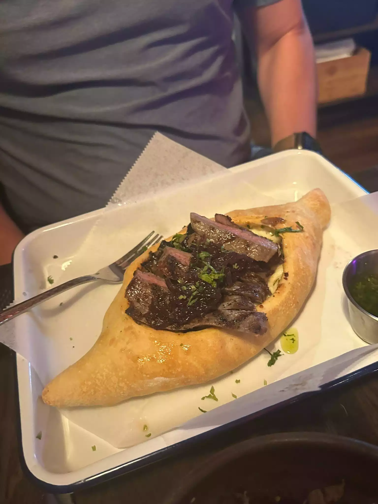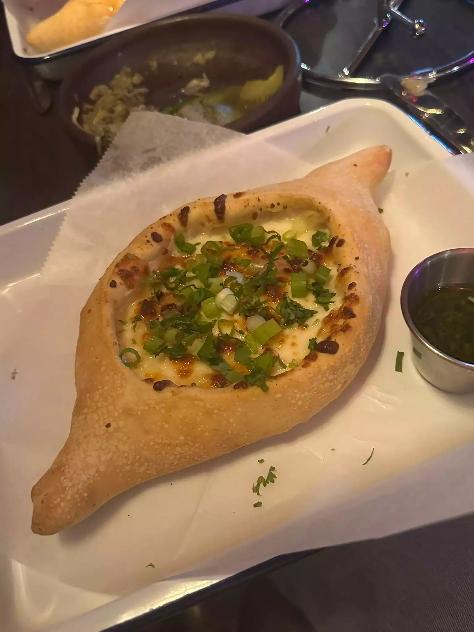 We decided to try a cuisine we never tried before, so after doing some research we settled on Georgian style cuisine. Cheeseboat offers a nice variety on their menu. We had the grilled eggplant appetizer (served cold), the mushroom cheeseboat (served with an herb style green sauce) and the lamb chakapuli (stew) and everything was so flavorful. The cheeseboat bread was delicious and very filling. We enjoyed the unique spices the food is cooked with, nothing like we ever tasted. The service was excellent from our server Giorgi. He was very friendly and accommodating. We have to go back again because there was so much more we wanted to try. The ambiance is very chill and relaxing with good music playing.