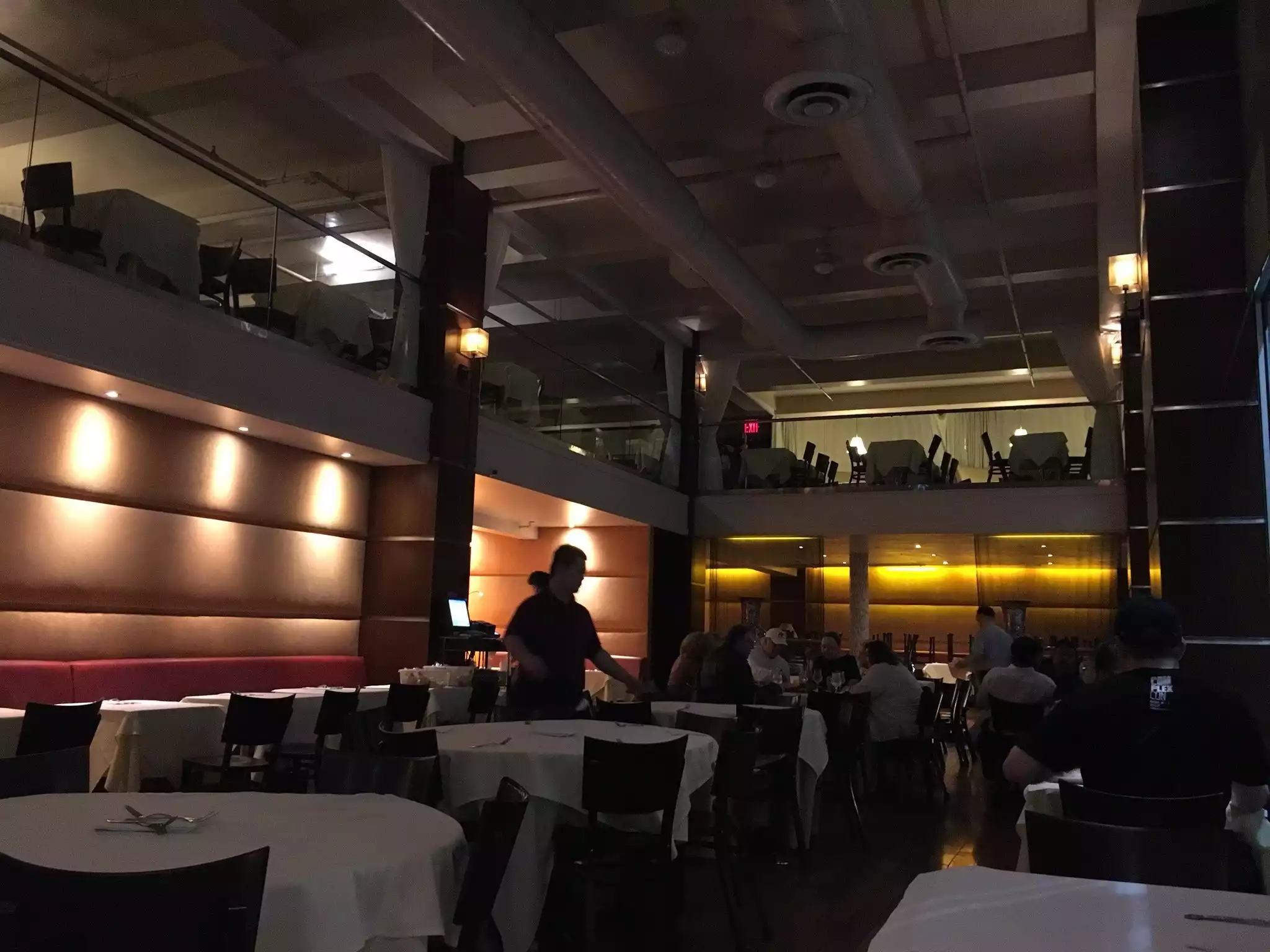 The service was quick -- quick seating, quickly served. The lower level was definitely colder than the upper level. Being seated on the upper level, I was able to eat without my coat on but upon leaving I noticed that people below ate with their coats on because the wintry air could be felt. Staff was friendly also.