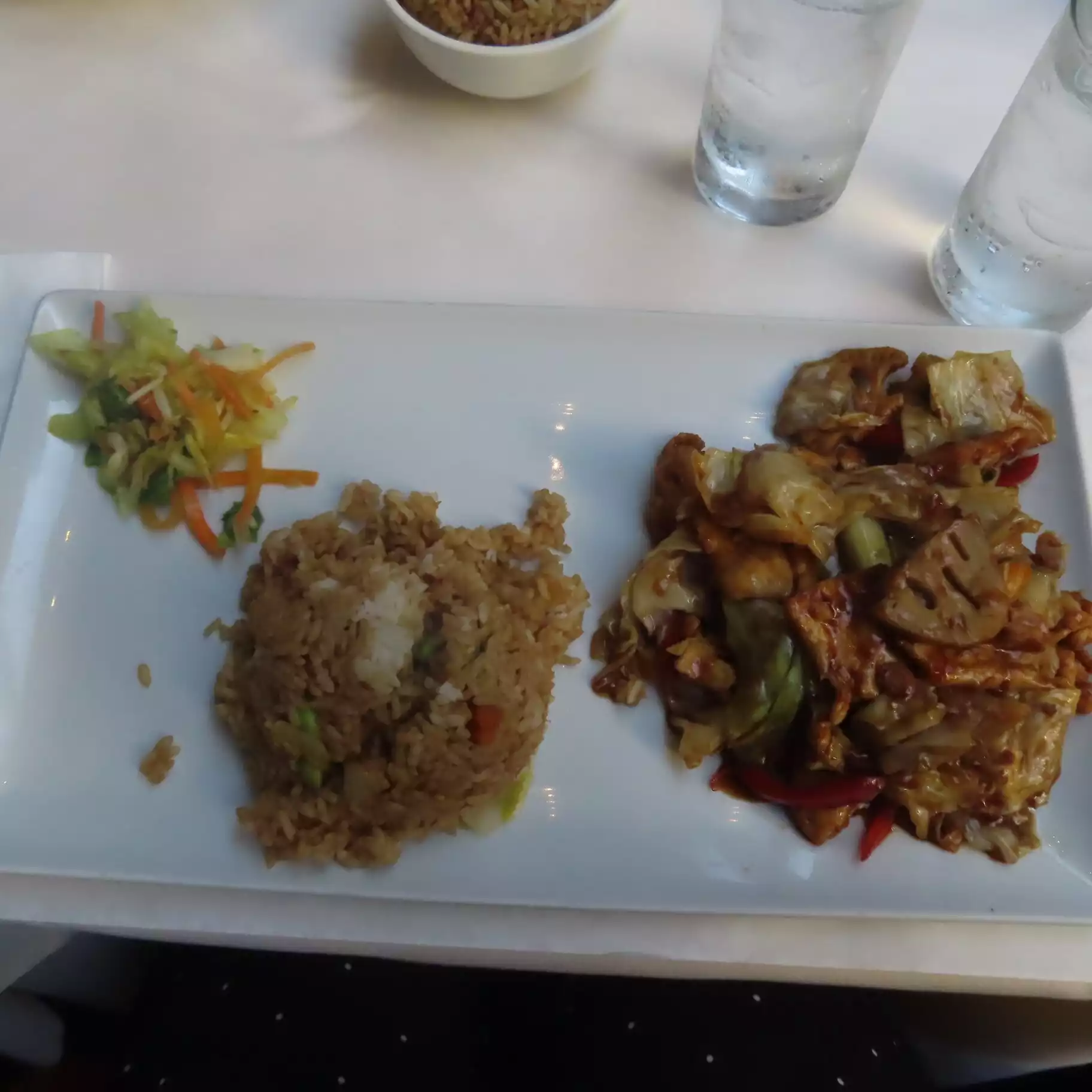 After reading reviews we were a bit hesitant as some people had said staff were rude. Staff were fine with us. We ordered spring roll starters, then for my main I had beef with peppers and white rice and my fiancé had schezwan chicken and white rice with a shared side of fried vegetable noodles. All the food was lovely and the alcohol was very strong!