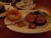 Excellent tenderloin filet steak. Milk bread was super dry and the quark, a cold cheese, was not good. Cool vibe. Experience somewhat marred by extremely loud large group that shone their phone flashlights at the menu, and our eyes, for 15 minutes. Not an exaggeration. When we needed light, the staff gave us flashlights, but not the large groups.