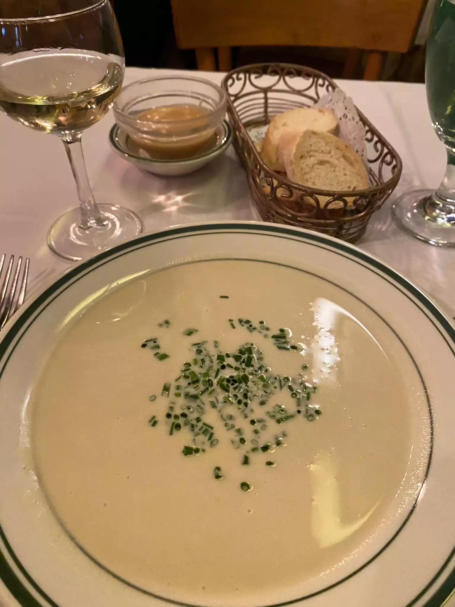 Amazing French Bistro in the heart of NYC. Silky smooth, slightly peppery, rich vichyssoise, best I’ve had. Tender Canard a l’orange with crispy skin and not-too-sweet sauce. Do yourself a favor and order a soufflé at the beginning of the meal. Carried proudly from the oven with a high crown and smooth ( in my case gran marnier) sauce was an amazing end to a lovely meal. Do not be in a rush! The kitchen does not and will not rush! Take time to enjoy yourself! Merci Madame!