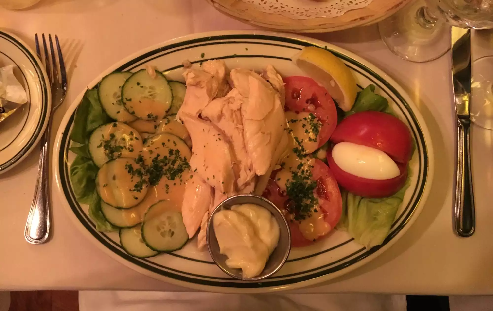 We visit this restaurant every time we are in New York. It is a little slice of France. You must have a reservation as it is very small. The owner is so pleasant and kind. I always get the cucumber salad with their signature dressing and it's light and good. I had the sole meuniere and my husband had the coquille st jacques. Both were delicious. Drinks are well made and the bread is to die for! My only complaint is as it was crowded, its a bit hard to get into your seat.