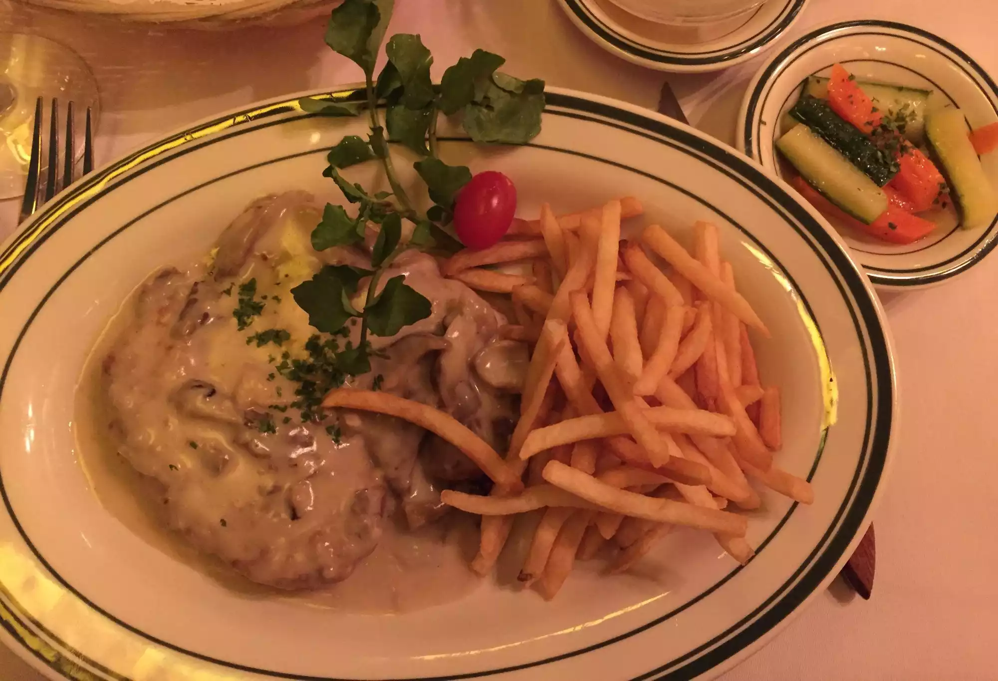 It's a lovely restaurant in every way. We had reservations for a Thursday night at 5 ahead of a play. We ordered cocktails, the mussel appetizer, wild boar stew, Cordon Blue, crepes & ice cream with chestnuts. Everything was wonderful and the service was top-notch. You also get a basket of french bread with a dipping sauce. You can tell this place has been around for years, and the decor is as quaint as you can get. The two women in the photo for the restaurant were both there the night we visited. I loved everything about this restaurant.