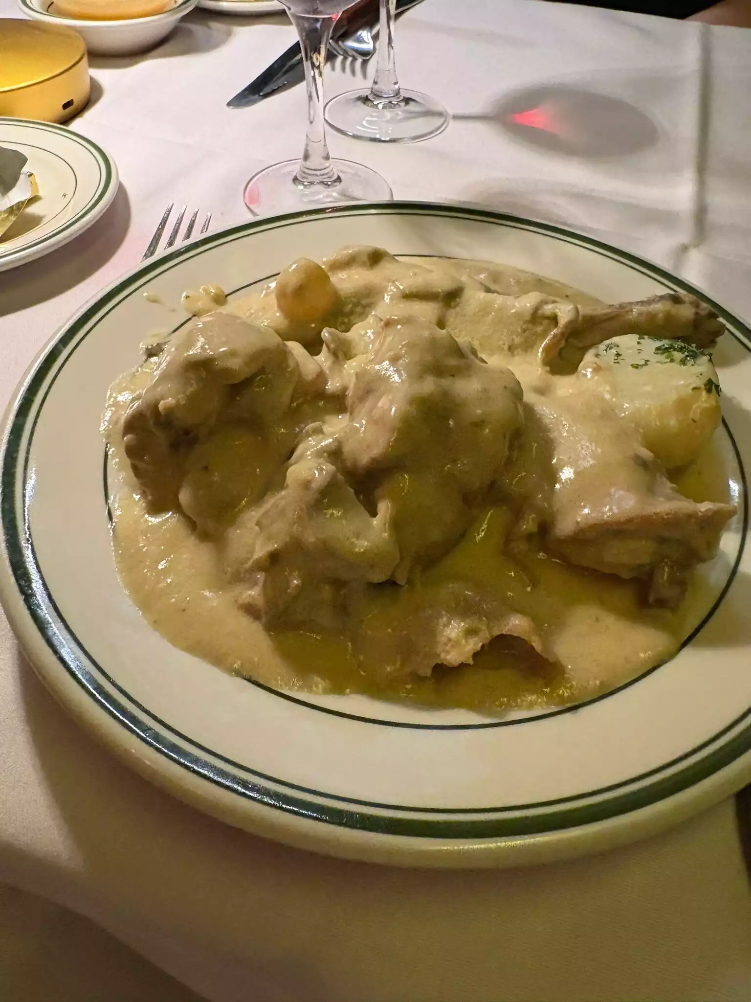 The food was excellent. The rabbit in a cream sauce was perfect. The sweetbreads were very tasty. Our friends ate the frogs legs and said they were spectacular. I hesitated to choose the escargots and the frogs legs because it referred to the sauce as having Absinth and I don't like that taste in food but our friends told me they couldn't taste any trace of anise...next time. I found the bread did not measure up to the food and is a shame. But the vinaigrette used on the leek salad and served for the bread was wonderful. We sat all the way in the back and I was taken aback by a chemical smell which made the meal less pleasant for me. The decor is very shopworn and could use a bit of sprucing up not a total makeover mind you. The service was prompt and lovely.