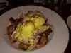 Have never eaten at a BBQ joint with coffered ceilings, but now can check this off the list (well, it wasn't really on our list). Anyway, stopped here on a Sunday afternoon towards the end of the brunch service. Started with the burnt tips appetizer followed by the biscuits and gravy (fortified for an upcharge with a couple of scrambled eggs and a hot link sausage). The smallish serving of burnt tips were cut up into small bite-size chunks and served on a bed of creamy cole slaw - the tips had a good flavor, although the slaw tended to overpower the more subtle aspects. The biscuits (there are two to a serving) were good sized if a bit doughy. The gravy had a good flavor, but was lacking in actual sausage and could have used some more pepper (we asked for some pepper and were given a little grinder, but it didn't actually work so not of very much utility). Worse, there wasn't really enough gravy provided to accompany the biscuits adequately (basically 50% to 100% more gravy would have made the dish much mroe satisfying). The hot link sausage was nice and spicy, which made up for the just okay eggs. Service was okay, but not exceptional. The price was very high - about $40 for this one meal, but this is a downtown restaurant so the overhead must be pretty high. Overall an okay meal, but probably won't be coming back as we can find much better away from downtown for much less money.