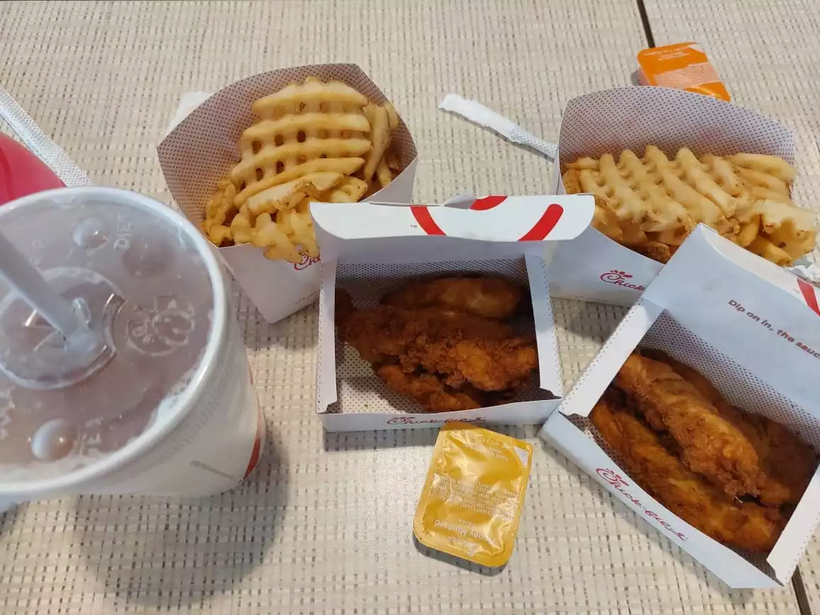 We have visited Chick-fil-A twice (within a week) and loved the food on both occasions. The restaurant was very busy but there were always people coming and going allowing us to get a seat. We had the spicy deluxe sandwich with waffle fries and Chick-n-Strips with waffle fries topped with Buffalo sauce and drinks. We found the food to be excellent on both occasions and left very full and happy. If you’re looking for excellent fast food at a reasonable price then Chick-fil-A is a must visit.