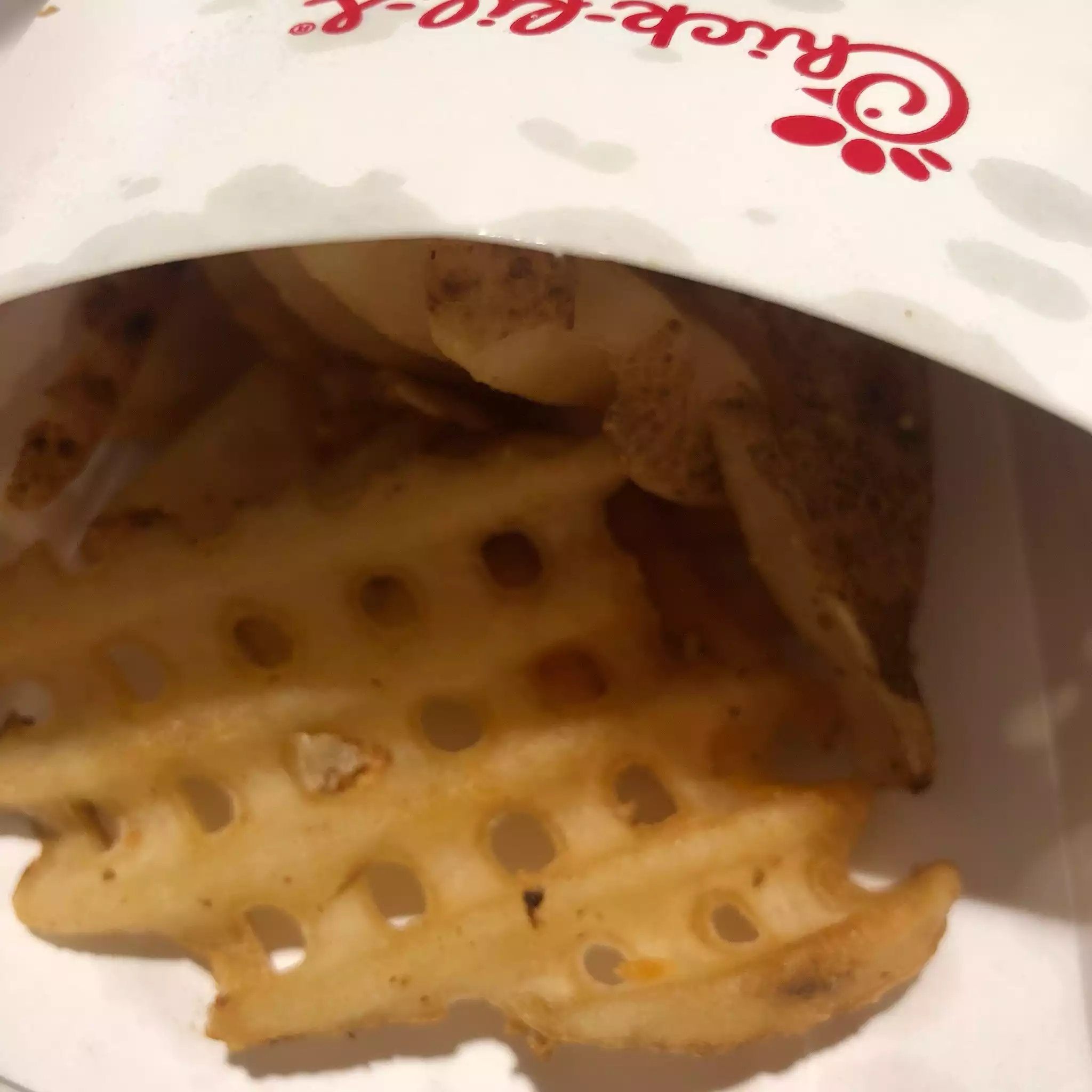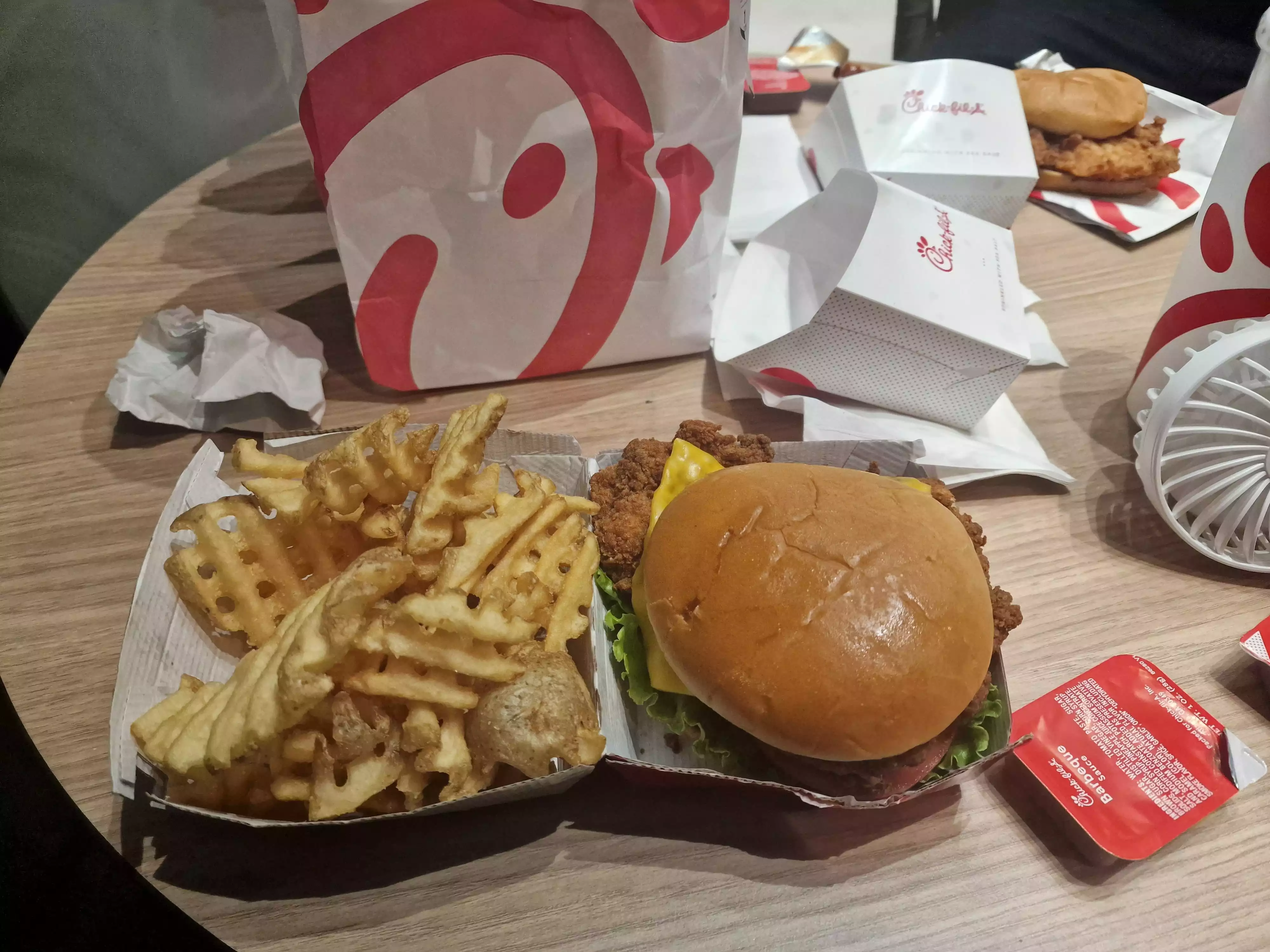 I use to look forward to eating here. The chicken in the chicken sandwich was a good size and tasted fresh. Recently, the chicken is a smaller portion, full of fried breaded crust. They no longer provide the Purell wet wipes. The serving of waffle fries is smaller too. I don't look forward to coming here again.